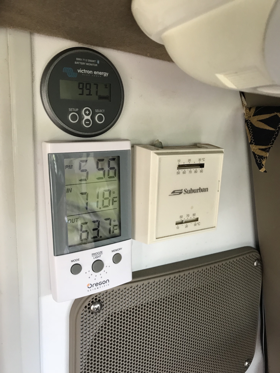 I had trouble finding a spot to install the screen of the voltage monitor, but was able to find a spot right next to the ceiling squished amongst the speaker, thermostat and thermometer.