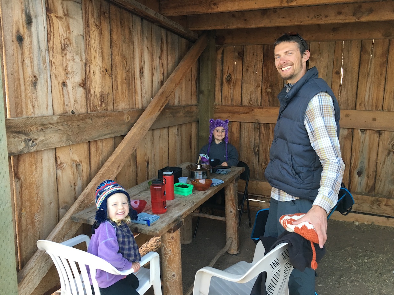 We got what we thought was the best site in the campground, complete with a lean-to split into two “rooms”. One side was occupied by an old army looking tent with two old cots and pillows inside. The other side had a wooden table and some random chairs in it. From the bits of hay around and other small hints, my guess is that the lean-to was once used by animals.