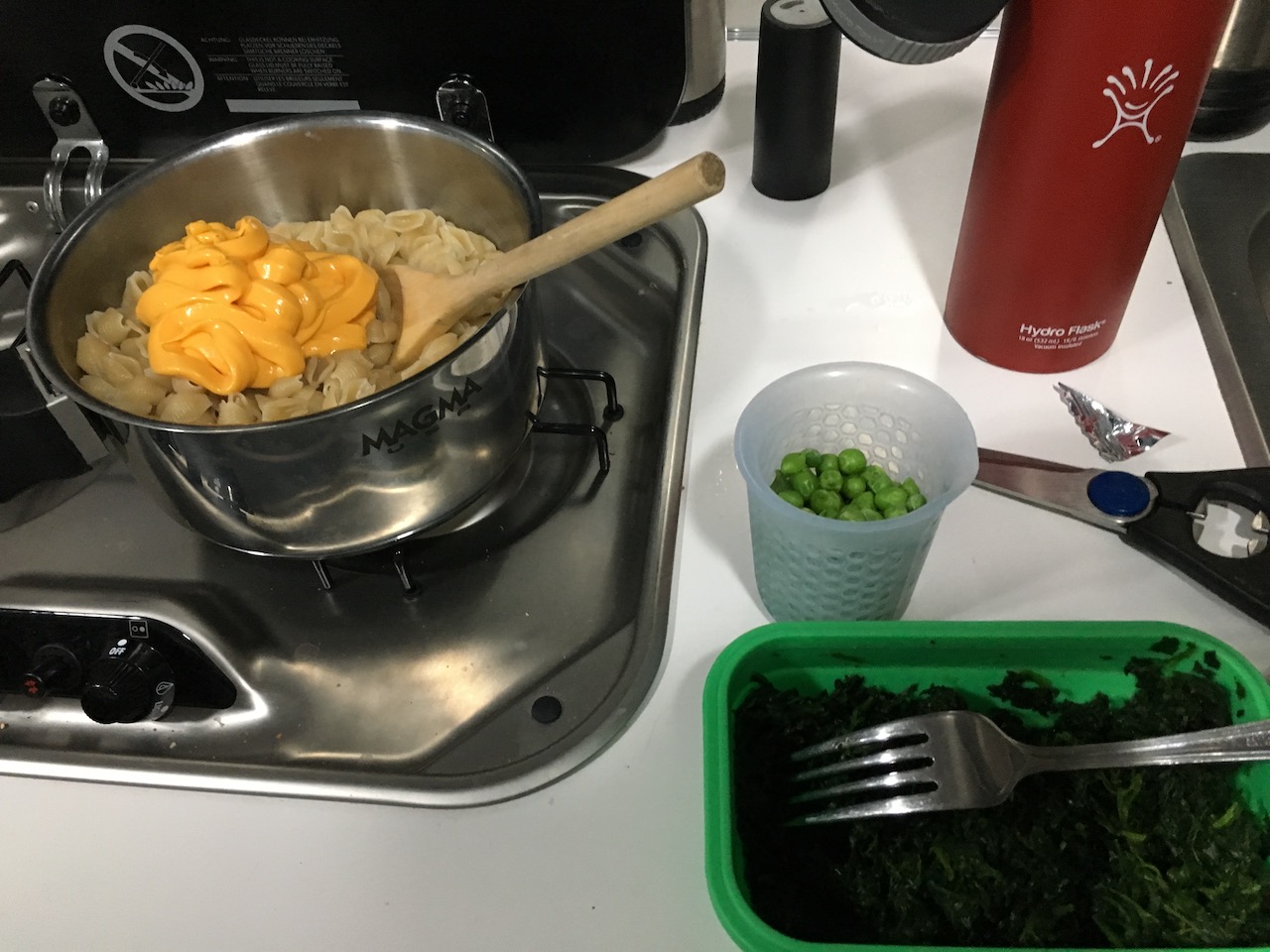 Since we arrived AT dinner time we needed something fast! Sadly, I am ashamed to say we fed our family what looked like an orange cow patty on noodles. Ahh! Some friendly campers next door to us back at the Salt Lake City KOA gave us some of their unused supplies, since it was their last day camping and they were flying back home. We took their Velveeta Mac ‘N Cheese to be kind, telling ourselves that we would only eat it if absolutely necessary. Unfortunately, that time had come! I added herbs, spinach, peas and cut the amount of “cheese” in half (on the box they did advertise ‘real cheese and milk’ but I am extremely skeptical). But man, there is no turning that into a tasty meal. The girls didn’t say that they didn’t like it but they only ate a quarter of what they normally do. Sorry those of you who are Velveeta lovers…it is not my thing!