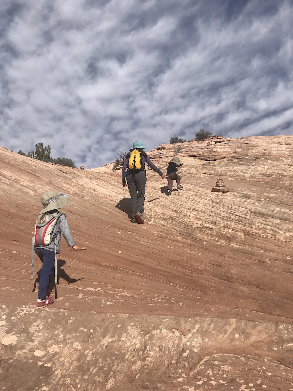 At the base of the butte, however, the trail became entirely different as we were now ascending rock layers. The butte almost looked like a giant was making sand castles in a rounded bucket. The rock beneath us was very steep yet had a gritty sand texture therefore was nice to climb. The trail did require rock scrambling and steep climbs/crawls but that made it all the more fun for us! Every time we are on challenging terrain like this I am impressed with the girls’ abilities. They are like little monkeys!
