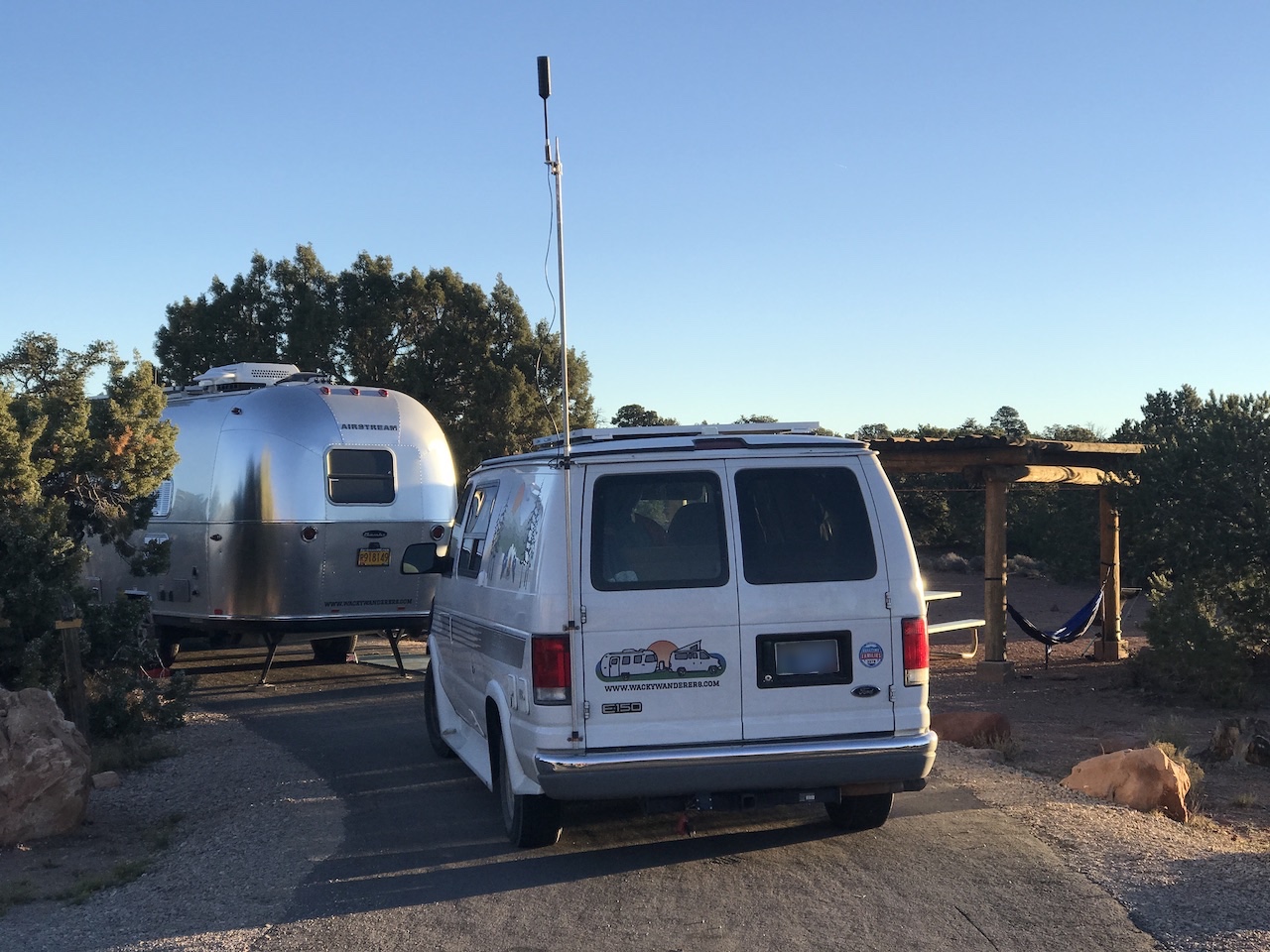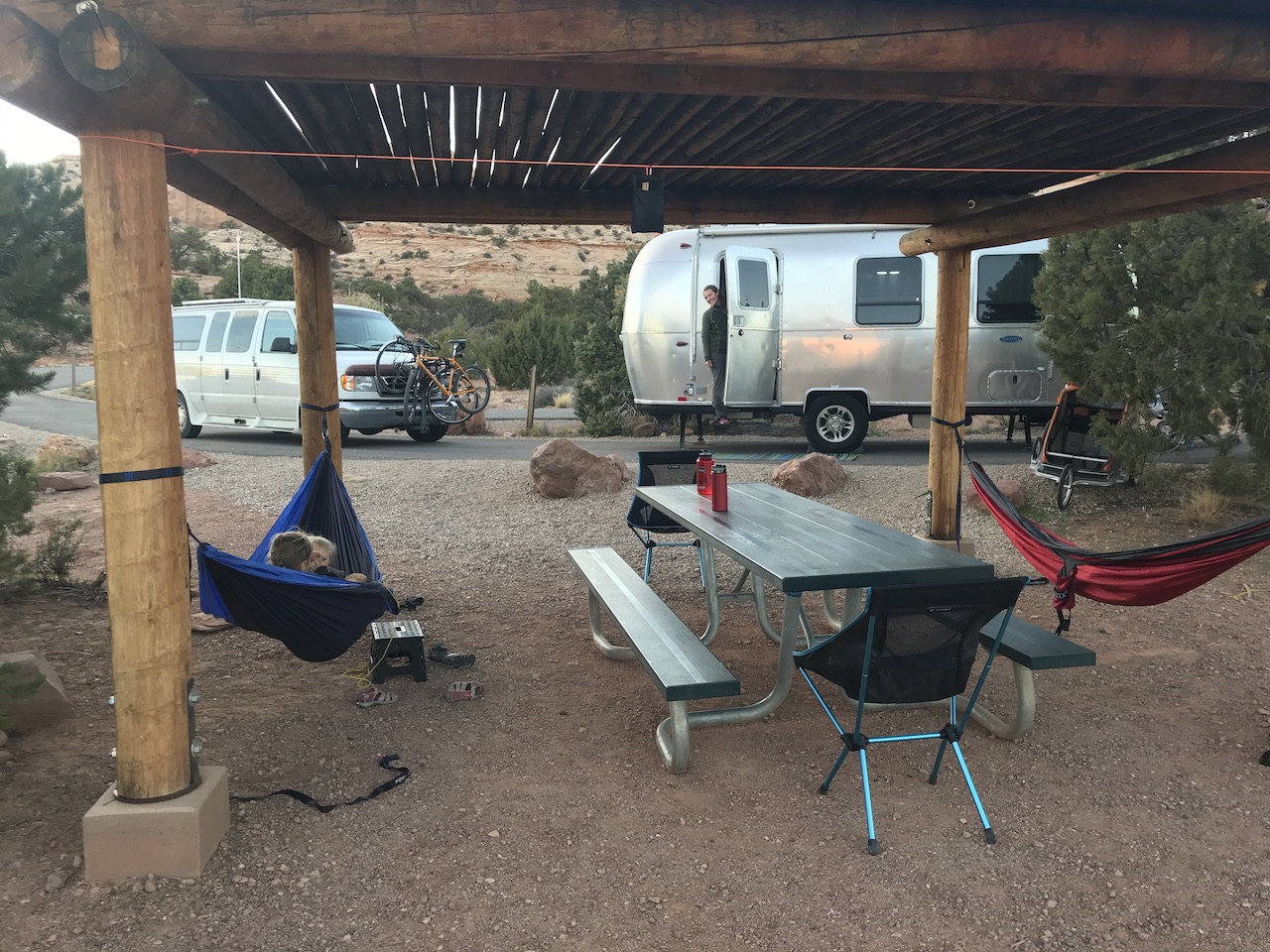 We were lucky enough to get one of the 12 camping spots at Canyonlands Willow Flats Campground. The sites were beautiful, only $15 (!) and each equipped with a log shelter over the picnic table area which we were able to hang our hammocks in! Our particular site was a pull-through giving us ample room for both Dimes and Wobbles.