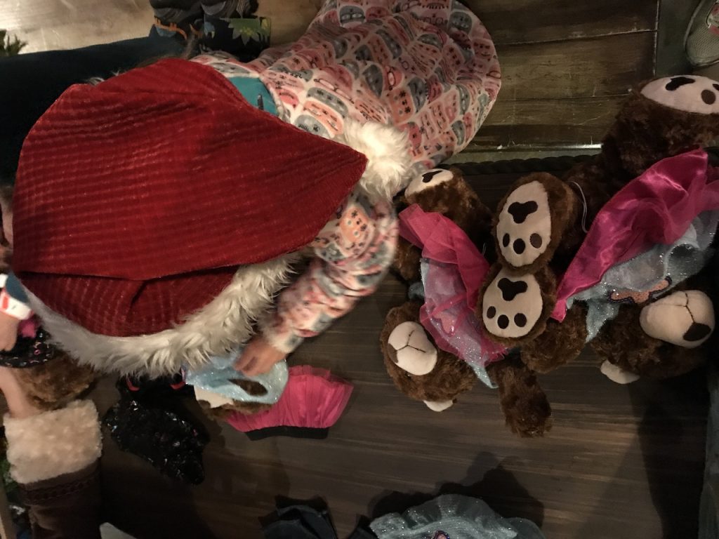 Next onto the toy making room where the girls were able to help dress bears which will be given to children around the world and assemble toy cars. The girls picked lots of tutu’s. :).
