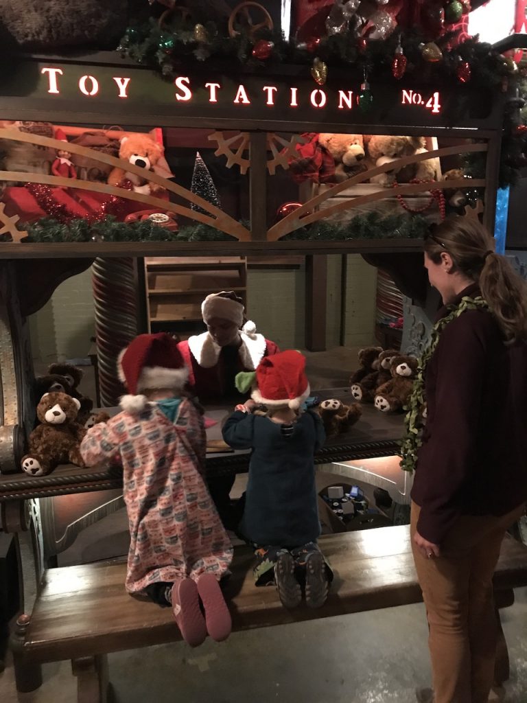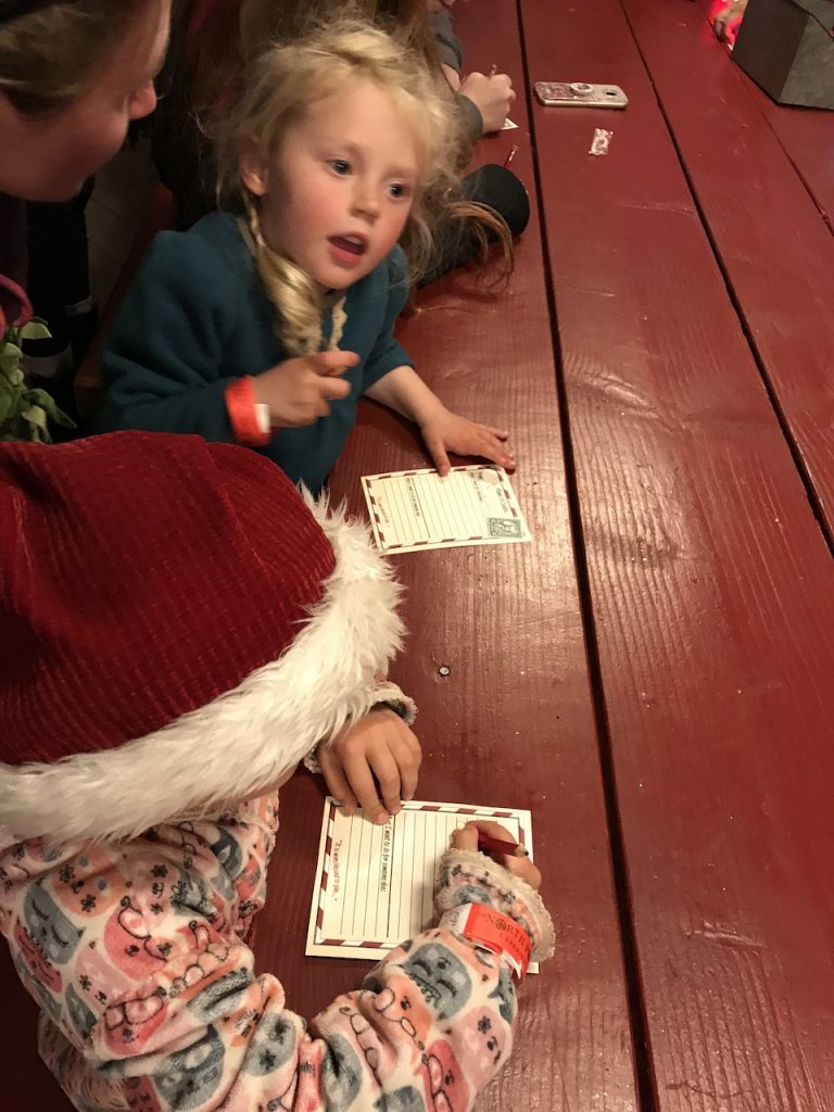 Lastly, the girls were able to sit on Santa’s lap and give him the letter they had written. The girls willingly sat on his lap (I was surprised too!). Soon after sitting on his lap our 5 year old grabbed our 3 year old’s hand for comfort and safety. It was sweet! They were given little teddy bears from Santa as well as a candy cane from the elves.