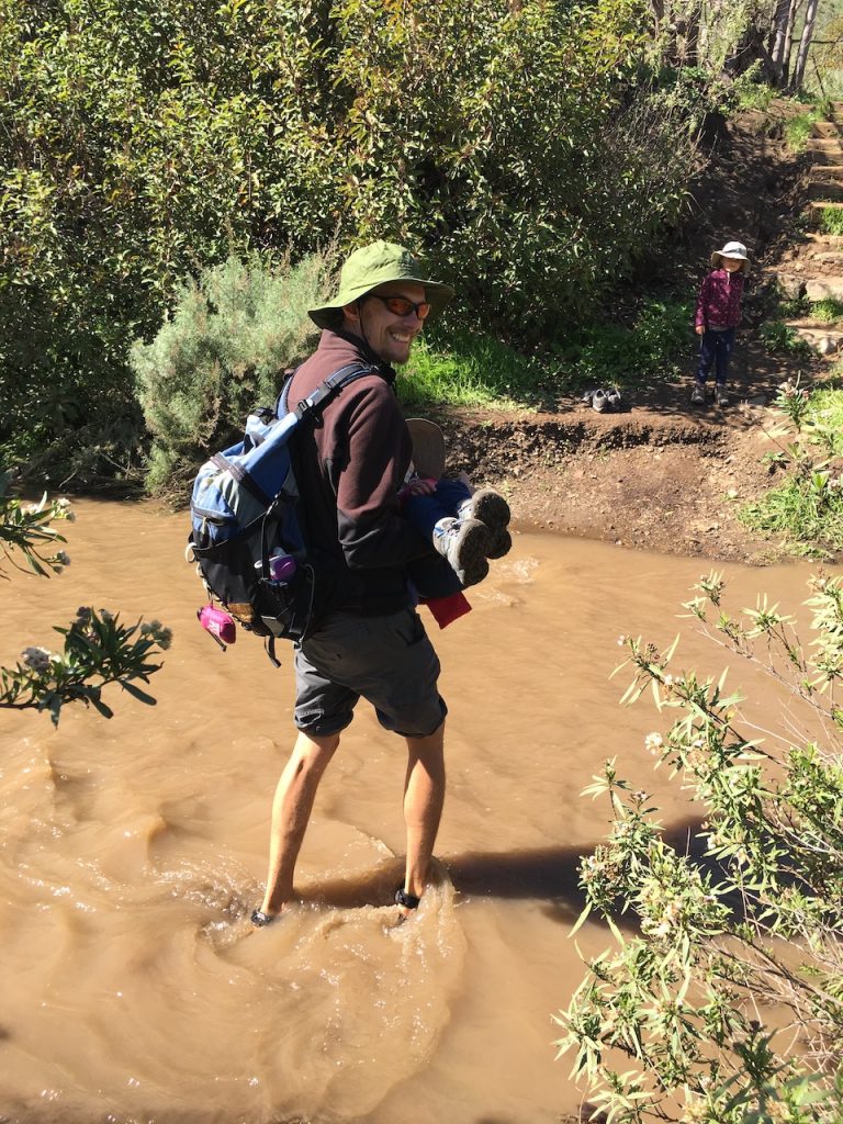 Very soon after hitting the trail we found that there was a river crossing. Due to all the recent storms, the dry river beds were now flowing with water. Hmm, should we cross it? We couldn’t tell how deep it was or what the river bed was made of (rock verses sand). I voted we either make a bridge or we try a different hike. Justin voted he go back to the camper and get his sandals on to carry us across. He won!