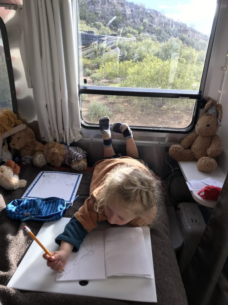 Instead of converting the dinette back to a table, we usually had our oldest eat at the tiny “desk” by the foot of our bed and our youngest eat on a small camp table on the floor.