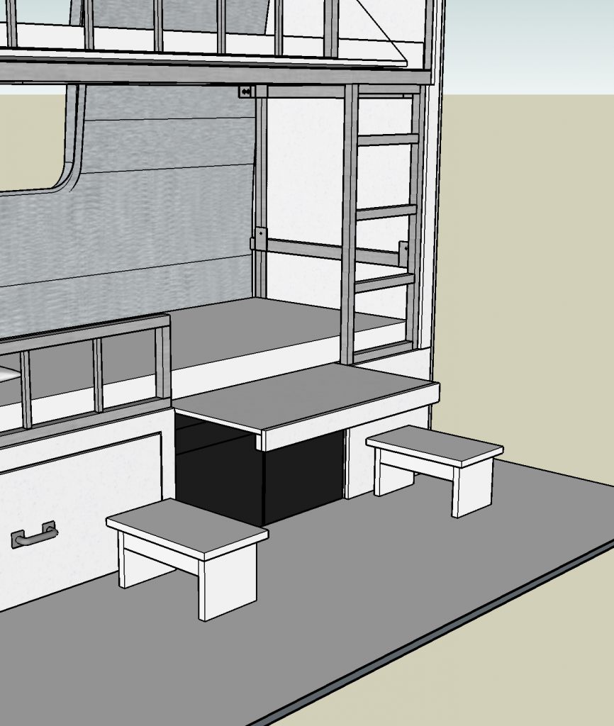 In addition to the kids table, there are two flip-down tables in the design. One flips down over the main bed, allowing someone to sit on the edge of the bed and eat at the table. The other flips down into the hallway and could serve as a stand-up eating table for adults, or additional prep-space in the kitchen.