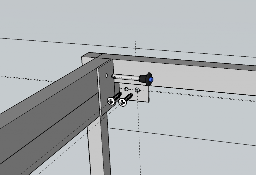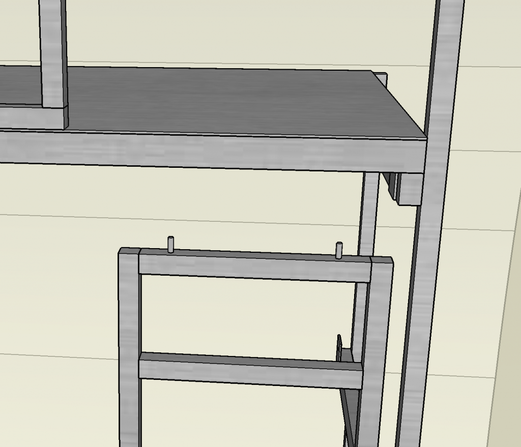 The guard rails will use a similar mechanism, with two pins on one side and a hand-turned bolt on the other side. This will allow the guard rails and ladder to be removed relatively quickly when converting to desk mode.