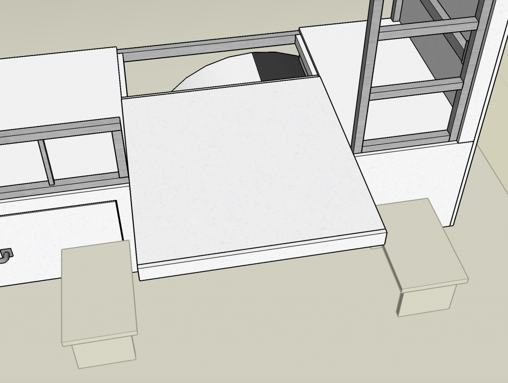 Although we won’t have a main dining table anymore, we incorporated a few table options into the bunk bed. First, there’s a slide out kids table. At only 15.5″ high our kids will outgrow it in the next few years, but making it any higher would have taken away precious headroom from the bunk beds.