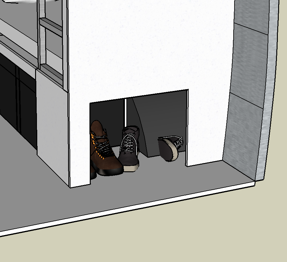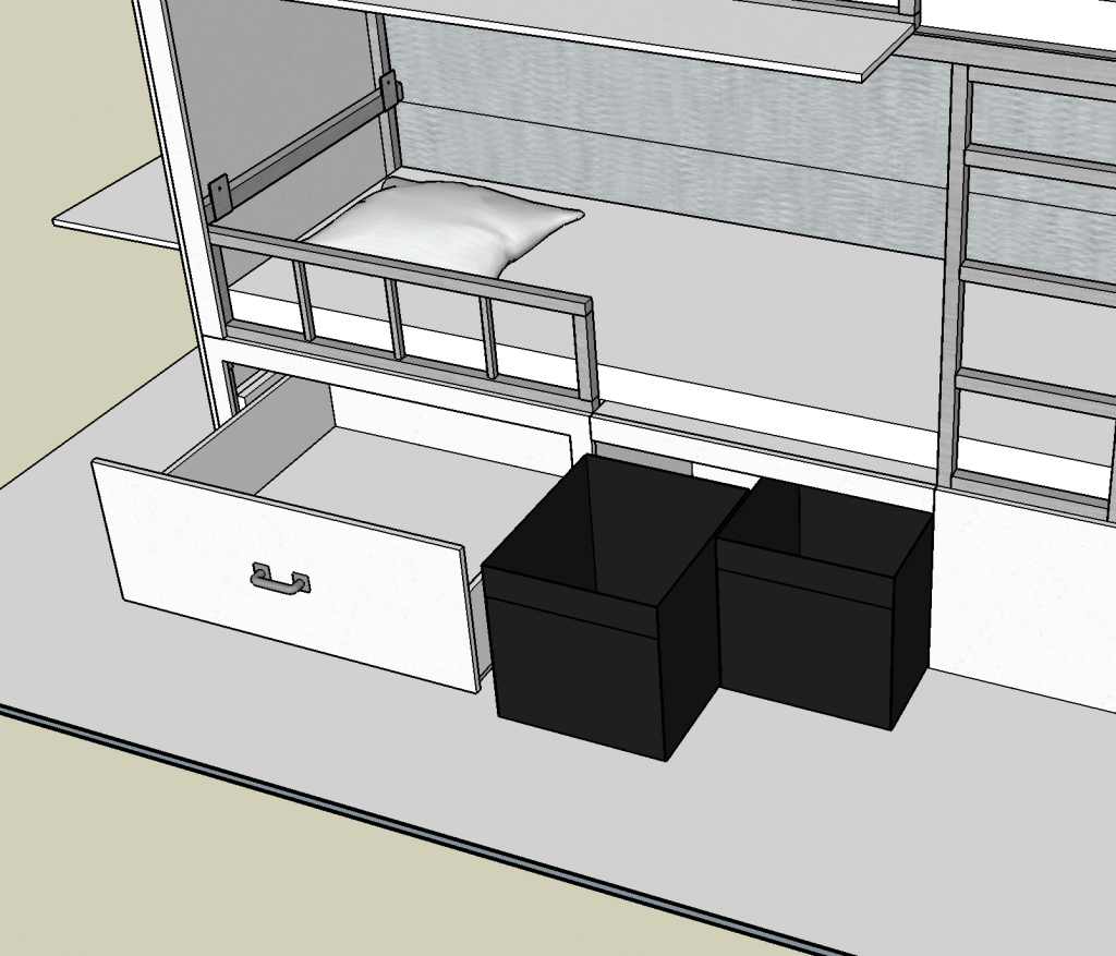 For storage, the design includes a shoe cubby on the side next to the entrance door, a large (28″ x 26″ x 12″) drawer, and a cubby where two IKEA storage boxes can just fit. This drawer will serve as our main food storage area, which will be a big improvement over the current storage under the dinette that is hard to access.