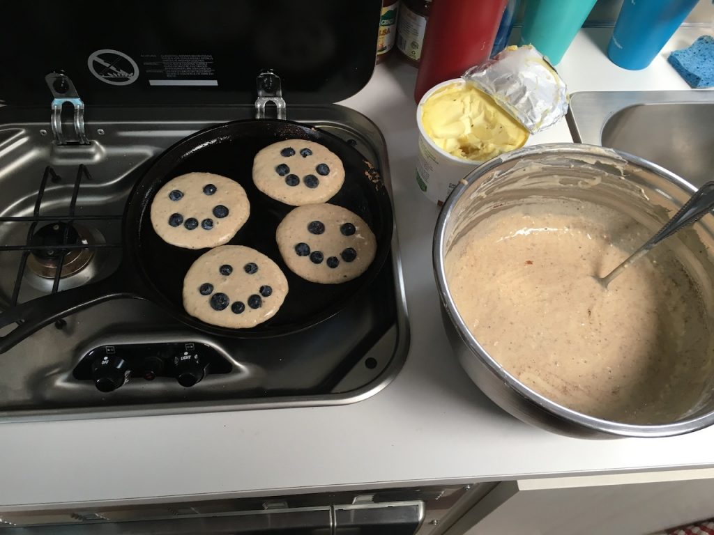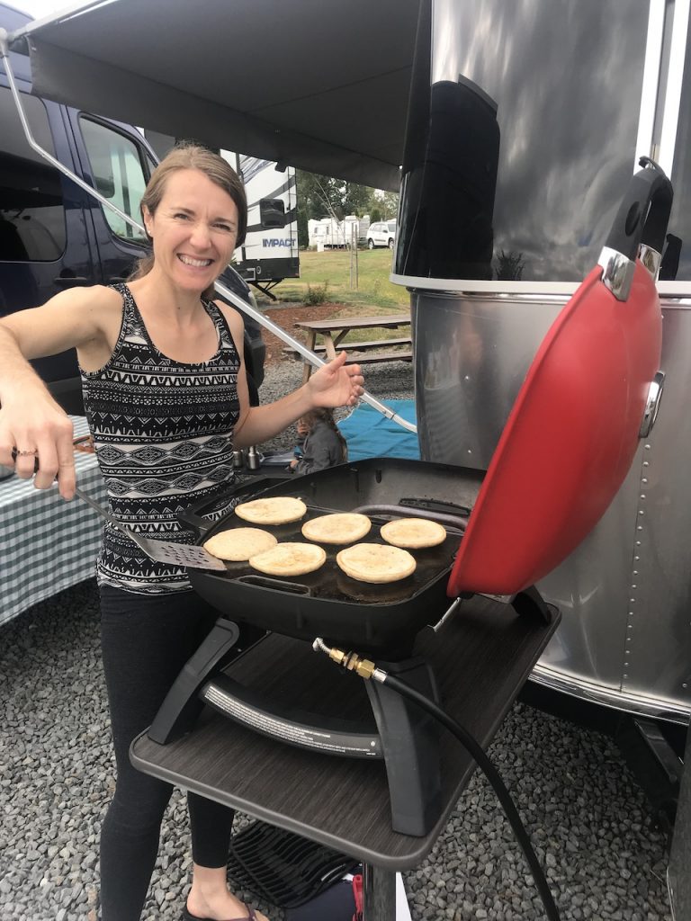 It was also on this trip that we made the discovery that our half griddle on our outdoor grill worked amazingly well for pancakes. Pancakes is always a must have while we are on the road camping but prior to this trip it involved much effort. I previously cooked the pancakes inside Wobbles in a skillet which would hold a max of 4 pancakes. It also involved cranking the vent fan on high for fear the smoke detector would go off from the sizzling butter in the pan.
