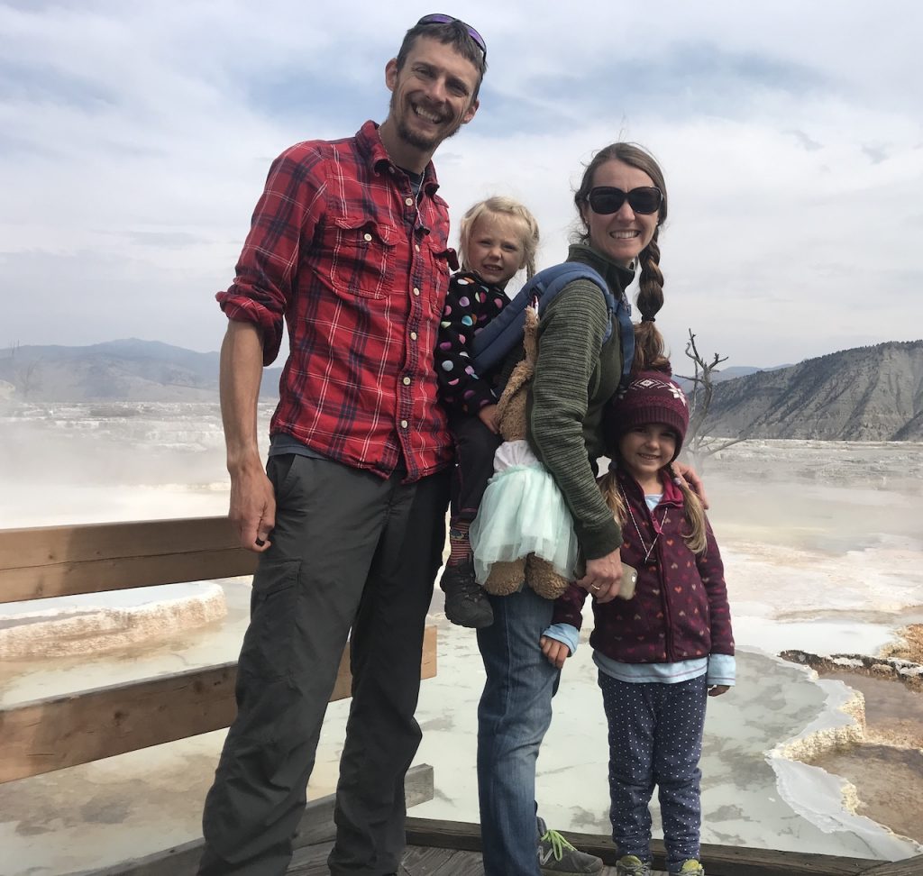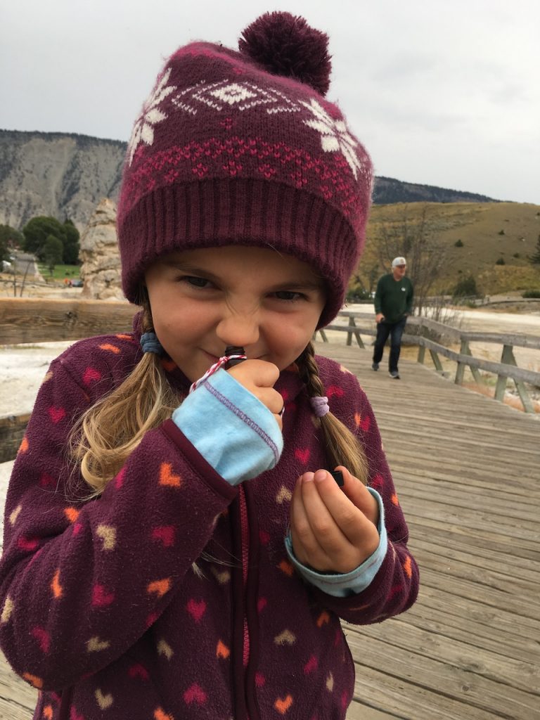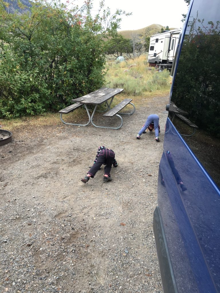 Our plan worked!!!  We woke the girls up before the sun came up, snuggled them into little blanket cocoons in Azul and headed into Yellowstone to try our luck snagging a Mammoth Hot Springs Campground site.  When we pulled into the campground there were already 3 or 4 rigs in front of us.  Not too bad.  Justin checked and the ranger at the desk said that at least a dozen people were checking out that day so we would definitely get a site.  Hurray!!  Bad news was it was 4 hours until check out so technically we could potentially be waiting for that long.  We were hopeful and excited to be promised a site!