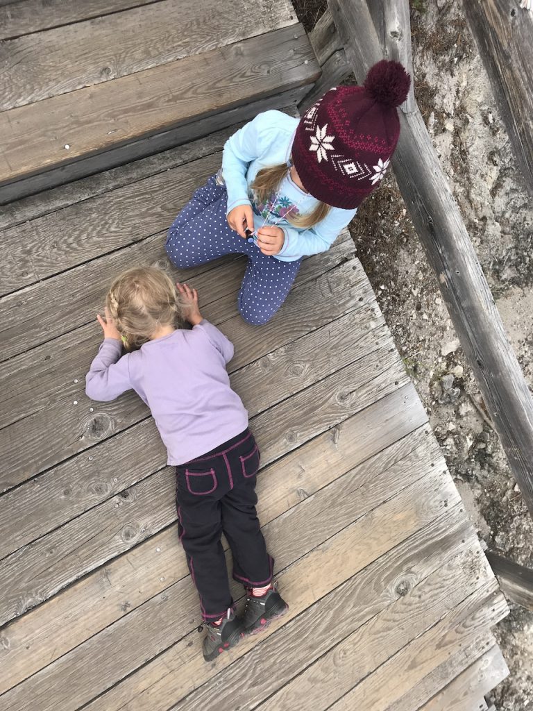 The boardwalk in and of itself is incredible! The paths around all these thermal features are quite long and are intricately placed to weave between and over all the attractions.  It must have been so challenging to build those structures on such uncertain and dangerous ground!  We were very thankful for the workers who made this park so easy to view.  The girls especially liked the knot holes in the boardwalk.  Such great peak holes for littles!