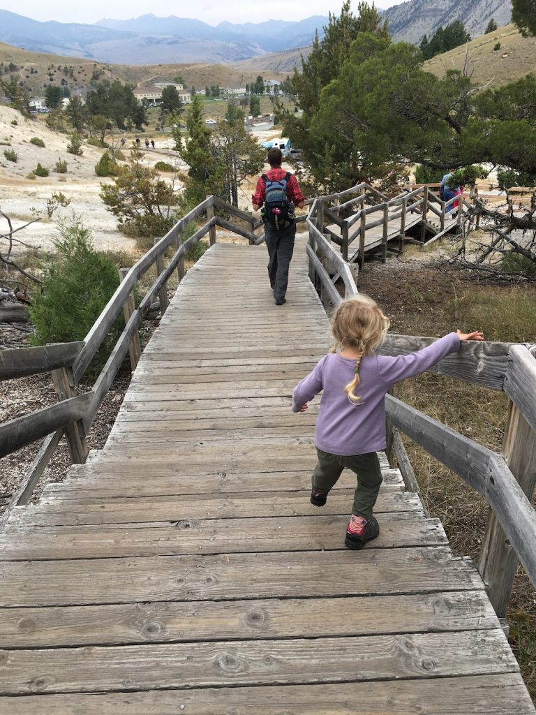 The Mammoth Hot Springs hike on the boardwalk was amazing but we also were getting punished by waking our youngest up early.  She was a puddle of whinning and tears.  Luckily we had brought the ergo baby carrier in Azul as a back up plan for the trip when the going got tough and boy was I glad we had it.  Our youngest willingly went into it (which was a shocker) and didn’t whine nearly as much once she was on me.  She had recovered to walk for the return trip and had some longer windows with no melt downs.