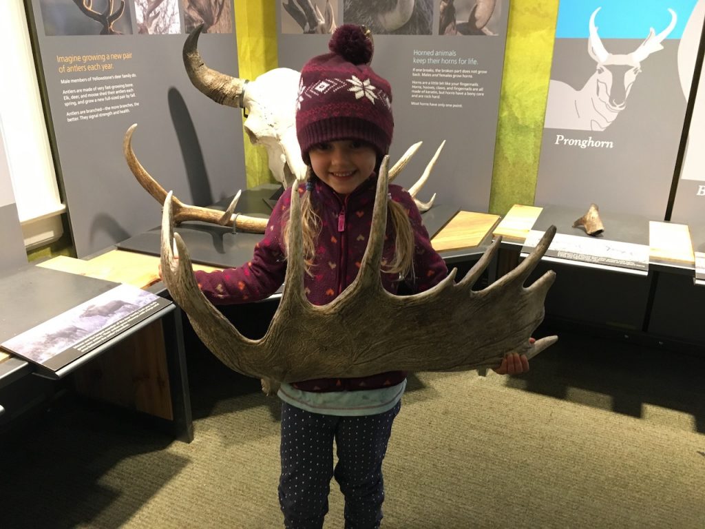 The girls got to check out the visitor center museum and feel how heavy all the many horns and antlers were from animals that frequent the park.  Big horn sheep win over elk and moose.  Though moose came in a close second.  To think, moose shed their antlers for the winter when food is more scarce but big horn sheet carry that weight all their life, every day!  Pretty incredible!