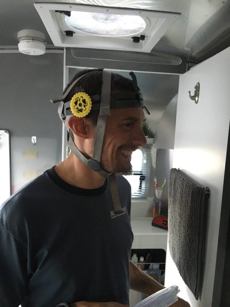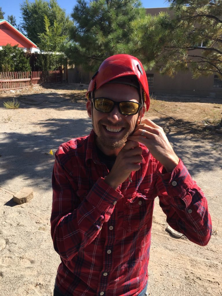After a very rough morning we were finally ready to head to the rock. Justin started Azul up and started to drive away when we all felt and heard a Bump, Clomp! Eek!! He had just run over something, but what?! Justin ran out to find that he had just ran over all his climbing gear!! He was horrified and I was relieved. I thought for sure it was a dog or some other animal. What a morning! Justin took out all his gear inspecting everything thoroughly. As it turned out, luckily it was only his $60 helmet that took the brunt of the collision. That and his new gear bag but I can patch that up no problem. The helmet, not so much. Though it did still fit on his head, somehow it looked a little less than safe. Luckily he had a bike helmet he could wear to climb with that day. And, he got a cool Halloween costume out of it! Not a total loss.