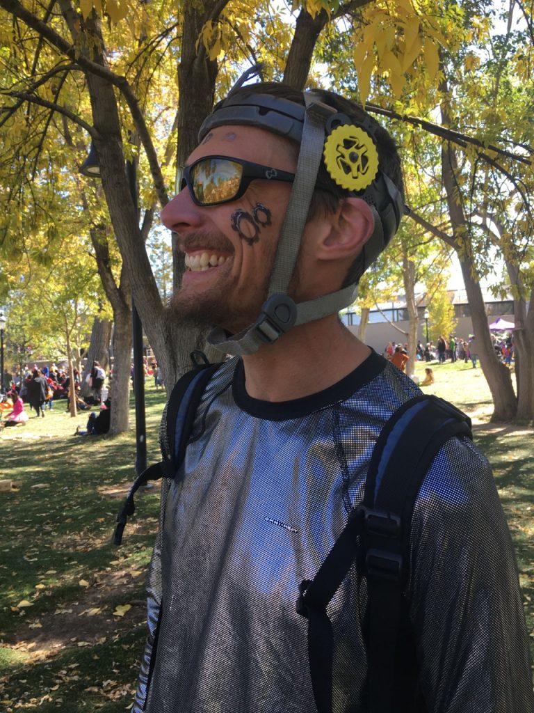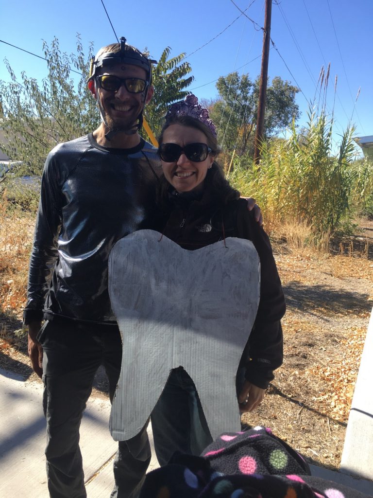 We spiffed up both of them with some face paint in the van before we went in.  Justin went as a robot with his broken climbing helmet remnants and his undershirt turned inside out.  I had forgotten the odds and ends I was going to throw on in the craziness of the morning but at the last moment I found that I had indeed brought a crown.  Since our oldest wasn’t going to wear her costume, I used it.  And just like that I was the tooth fairy.