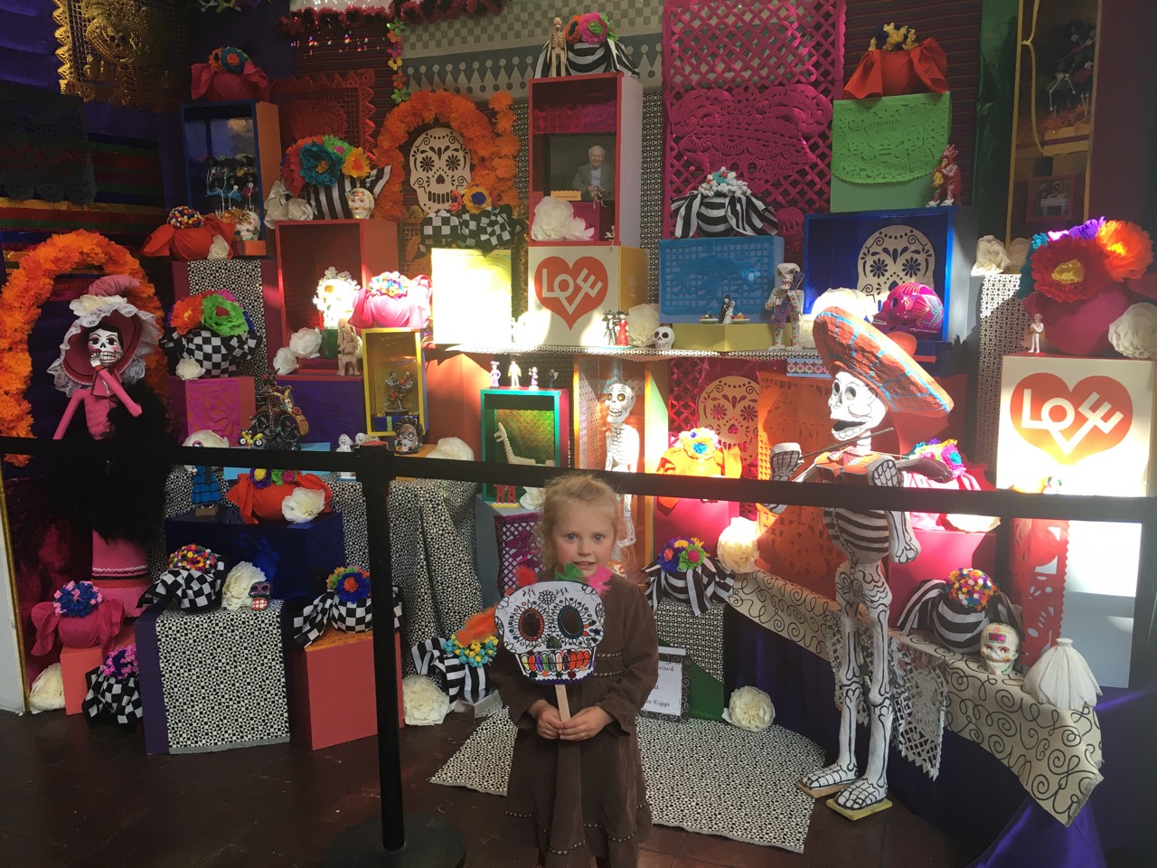 A family that we met on the road who also have young kids told us about a Day of the Dead festival that was going on at the local art museum. We decided to check it out as it sounded fun! In the parking lot we were greeted by a group of sweet horses who’s riders were giving out treats to the kids. The one horse even reached his head into the van to say hello as the girls were sitting in the fridge. The girls were thrilled!