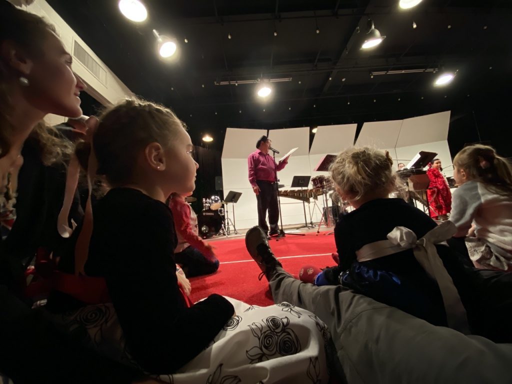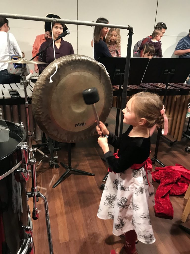 Let me start this part by saying that we had a great day it just wasn’t what we expected.  The symphony was a percussion group performing an outer space act.  When they did play it was great but most of it was them acting out a script about aliens and astronauts.  The percussion players tried to make it fun for the audience with having kids play some instruments but for a number of reasons it didn’t work out well.  The whole act was set to the background of dozens of kids screaming and yelling “mama, I don’t like this!”  It was a lot to ask the little ones to sit still for that long listening to a skit.  The audience got to sit on carpets on the floor for a great view which was neat.  The girls seemed to like it just fine so that was good.