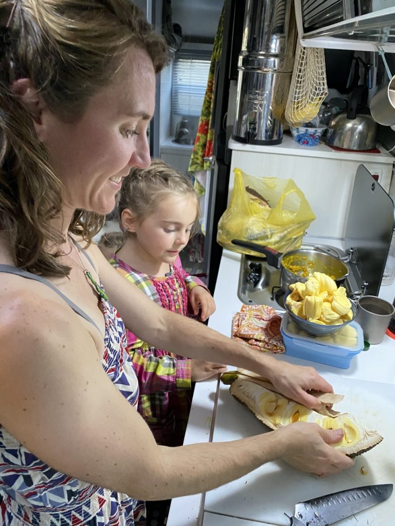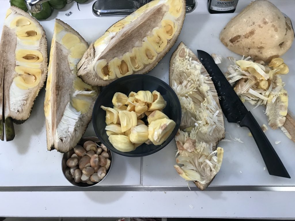 Jackfruit was an endeavor to get the actual fruit out but it was worth it!  The jackfruit that we bought was only 8lbs but its not uncommon for them to weigh 150lbs!  Crazy, right?!  We could only barely handle the amount of fruit that came out of the one we bought and get it to fit in our fridge.