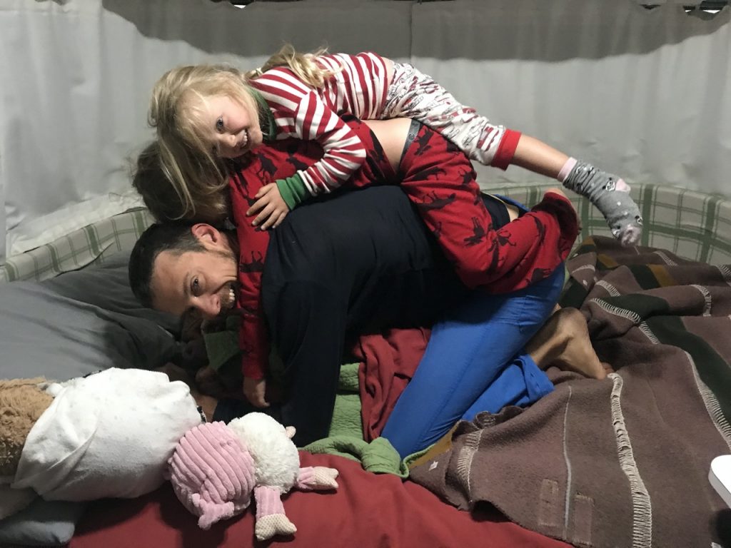 I just had to add this to one of my posts.  While on the road there are some of our Portland daily or weekly routines that we miss dearly. However, there are some new routines that we have established on the road that are so sweet and will miss.  Since we are all living in such tight quarters if one of us is awake and moving around, we all wake up.  Therefore when my oldest wakes up (she’s most often the first to wake) she crawls into bed with me and we quietly read to each other from the Kindle.  She usually first reads to me and then I read to her as we snuggle forehead to forehead deep in my covers.  When our youngest wakes she then grabs Bun Bun (her favorite bunny stuffed animal) and crawls into bed with me as well.  She lays on top of me, head on my chest as I continue to read our chapter book from the Kindle.  We usually do this until one of us is bursting with pee, which is usually me.  It is just such a sweet and snuggly time that I will miss if we lose it at home.  Such a nice start to a day!