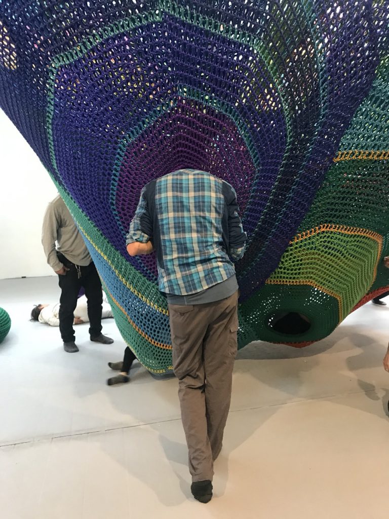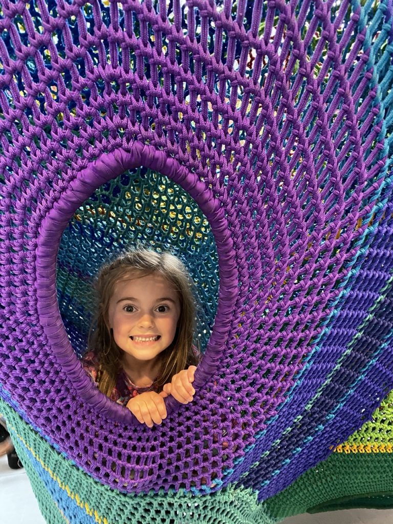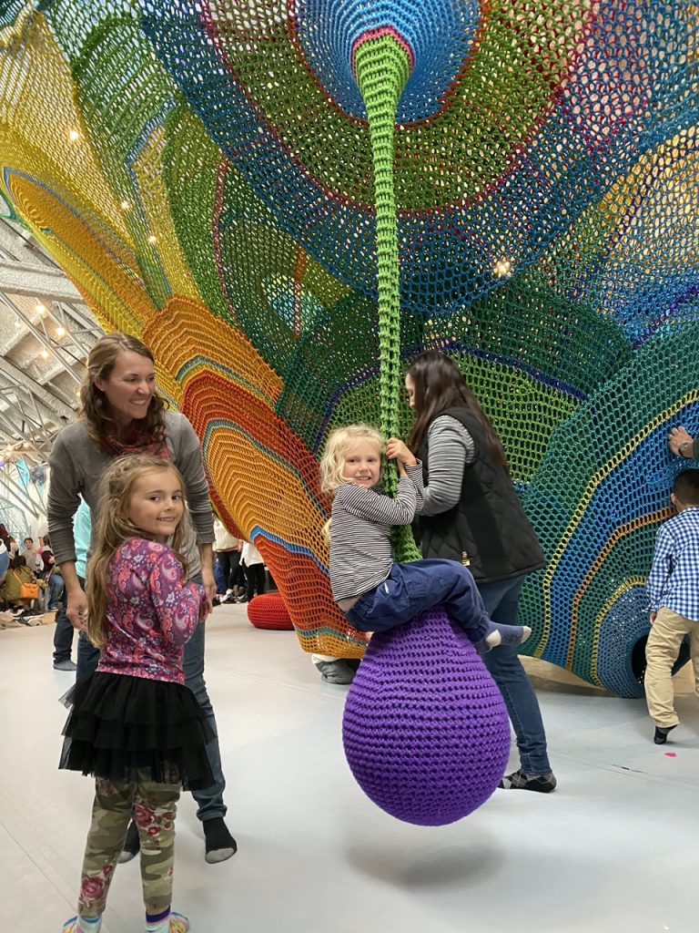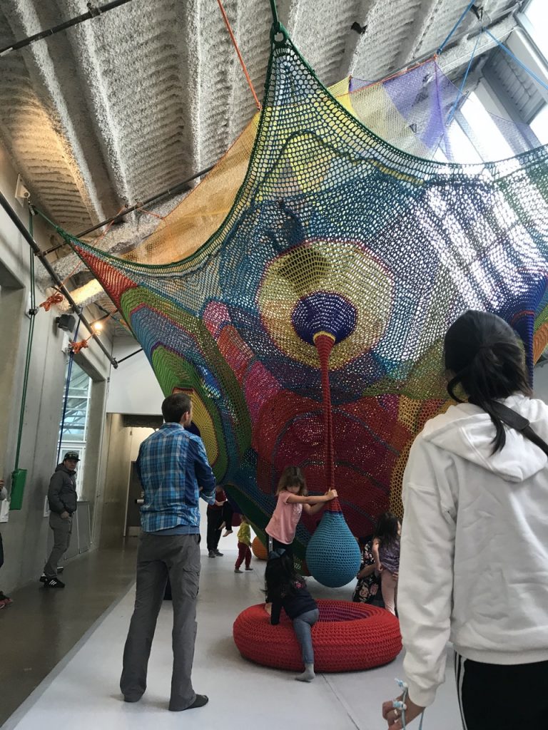 We made the best out of it and the kids didn’t seem to be too bothered by the crowds.  There was a new exhibit which was a giant crocheted net made of rope with various sacks and swinging balls for the kids to play on.  It was very well done!  The girls weren’t sure about it at first.  I wasn’t sure about it at first!  There were 4 different layers to the net each one leading to the next through hidden holes not much bigger than a kid.  To give some perspective, Justin’s shoulders couldn’t fit through so if a kid got stuck they were really stuck for a while.