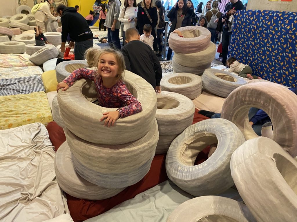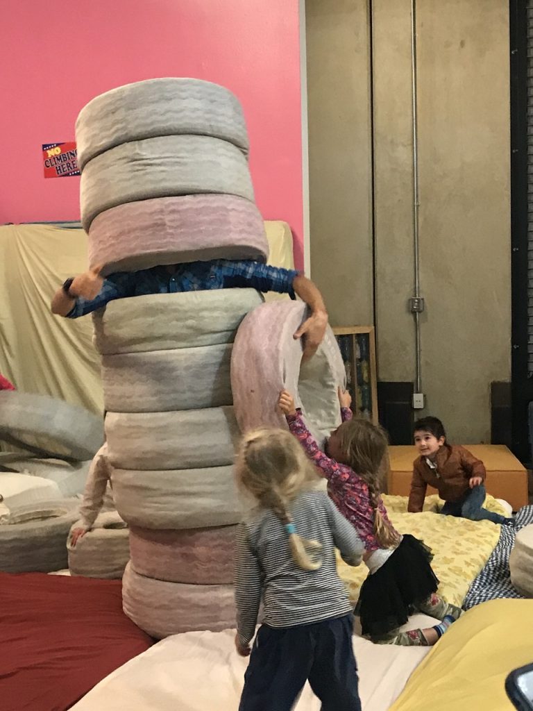 Another one of the girls’ favorites was the mattress room.  The museum filled a large room with bed mattresses on the floor and walls for the kids to jump around on.  There were soft pillow car tires to play with in there as well.  Justin was a good sport and played in this room for a while with the girls as they covered him in the pillow tires and then knocked him down.  It was pretty funny!