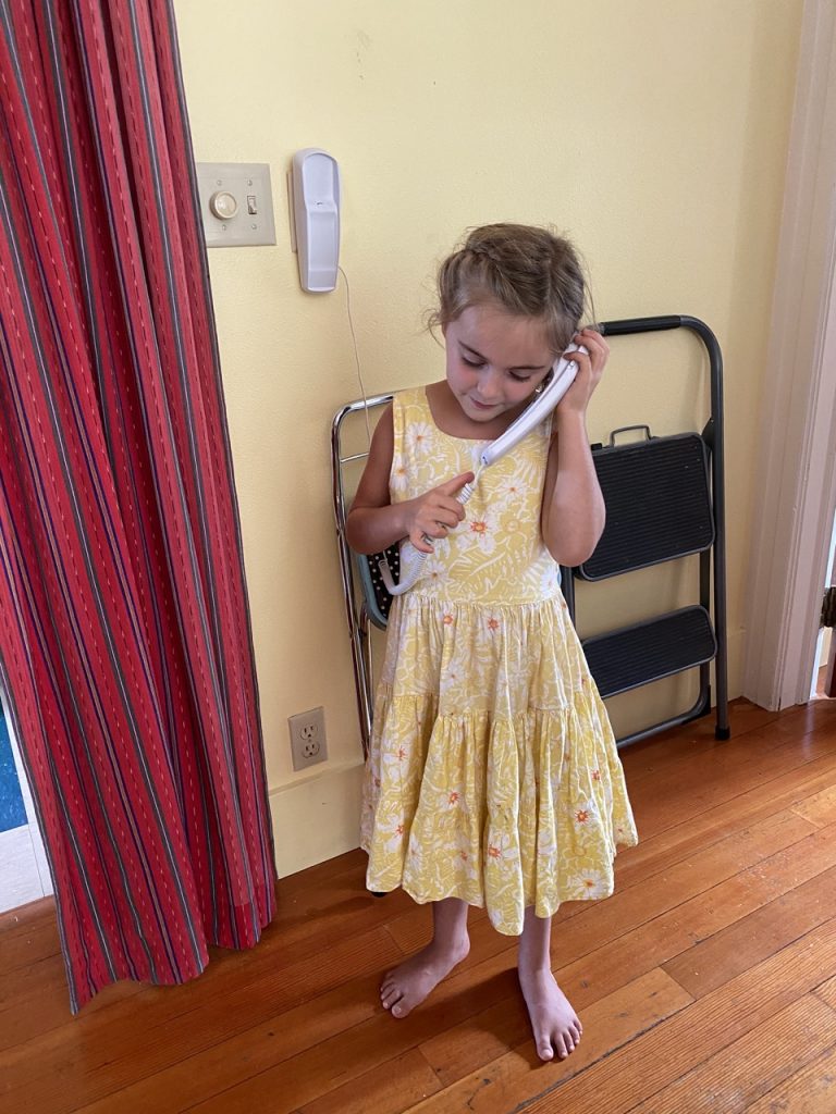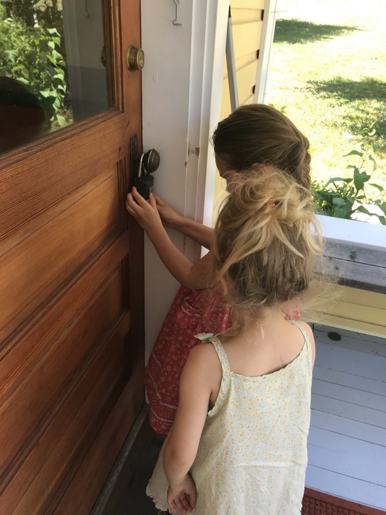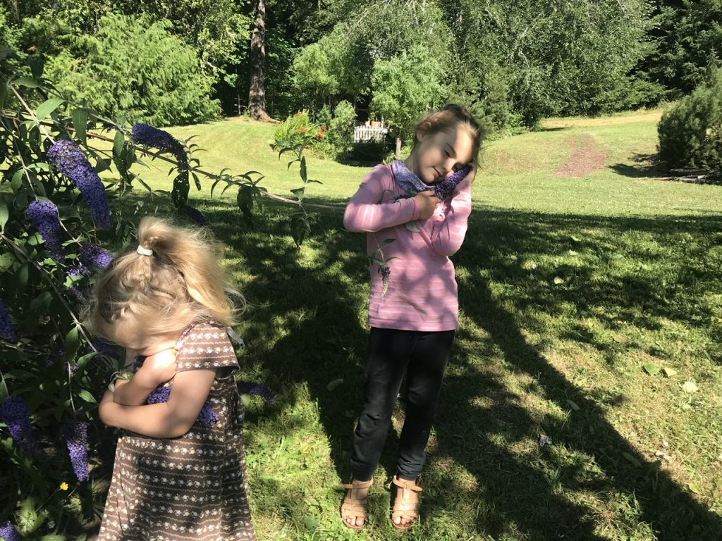 We also have a landline which feels like a blast from the past. We wanted to be sure the girls had a place they could count on to have a phone in case of an emergency and we could have a reliable phone when the power is out. Grammy calls have been fun for the girls. 🙂 Walks to the covered bridge have been slow, in a good way. We have to pick our way down the road as we sample and collect black berries. So far we have done one bike ride as a family to go visit some horses down the road. We’ll have to have some apples ready for them next time. I can’t say they were thrilled about the grass on the other side of their luscious field.