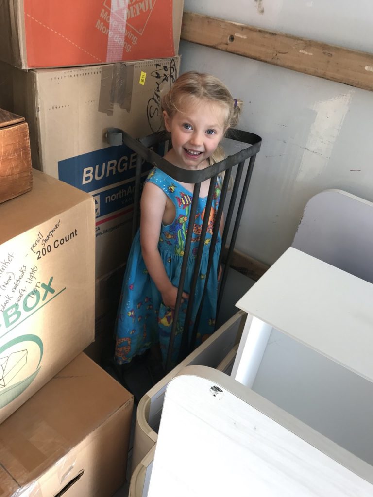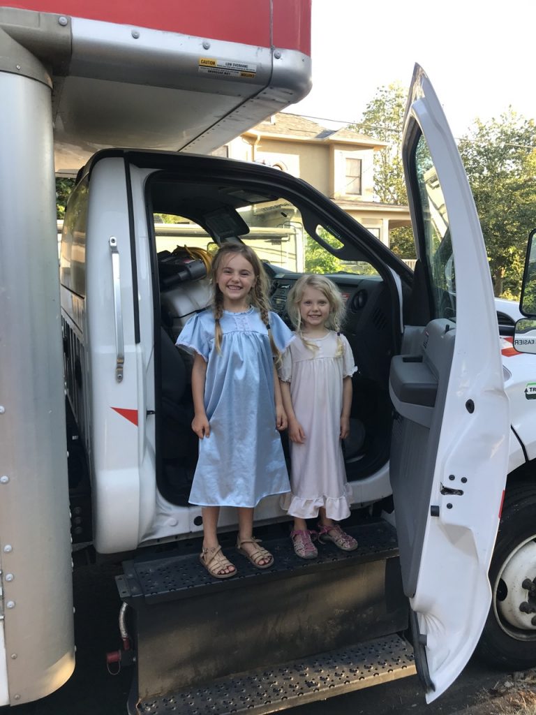 We got the biggest moving truck U-Haul would give us thinking that would be more than enough space. We semi-casually loaded the truck fitting boxes in tight but not packing things to the ceiling. Until, that is, the truck was half way full and we still had A LOT of stuff! That’s when the bags of bedding went flying toward the back and we sent our children on top of the box piles to help shove things back. We ended up having to take a handful of loads back and forth from Portland to Eugene. The girls and I did the first trip down in the van and Justin took the moving truck.