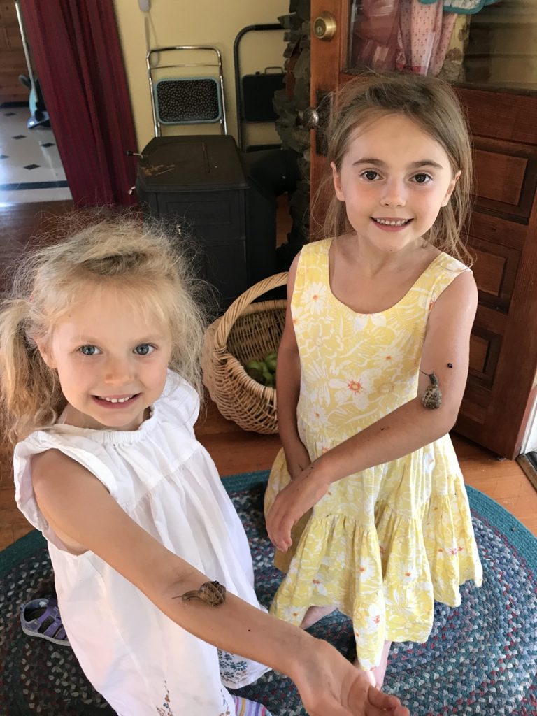 The girls acquired their first 3 day pets at the farm; SNAILS! Our girls had so much fun with a group of 8 snails they found near our compost pile. What a hoot! I was starting our compost when our girls came over with snails crawling all over their bodies. “Look! We’re like a playground for the snails!” they shouted.