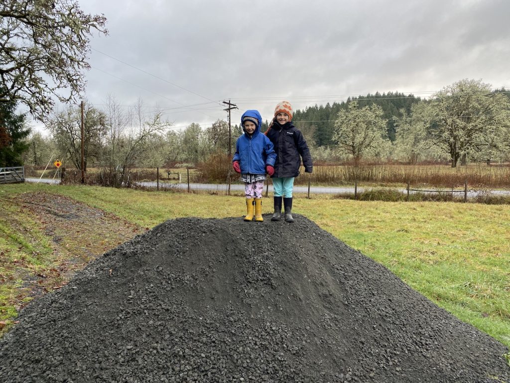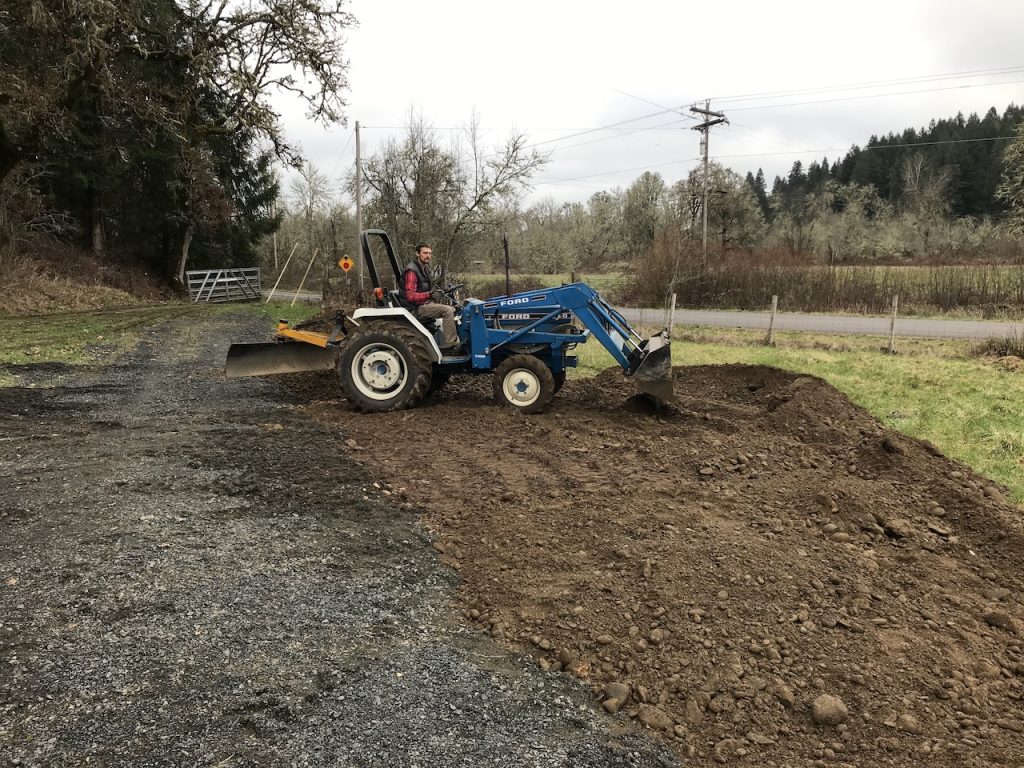 This was no small task! The first truck FULL of gravel we got was 15 tons, which sounded like a lot! Well, we learned that it’s not a lot. Not at all. It was kind of like seeing a little ant hill on a beach. Haha. We laughed so hard at us being so naive. Justin calculated out how many tons he estimated us needing and, yikes! It was a lot!! So far we have had 250 tons of fill dirt (which is non-clay dirt mixed with rocks of various sizes; some the size of Butternut!). Justin scooped the dirt piles with the tractor and after he dumped them I spread them out evenly. He then attached a grading tool to the back of the tractor and as I shouted commands (the tractor is loud) we slowly leveled the camping pad. We learned that this is not such an easy task. We have spent many afternoons looking at the pad from different angles and adding or removing dirt here and there. It was a bit trickier because we were not only grading it away from the barn in one direction but also angling it away from the hayfield in another direction. It felt like we were little tiny ants moving the dirt around. Progress was slow to be seen when moving such heavy materials. The last step will be to add a final layer of gravel to the top after the dirt has experienced some more rain and had time to settle. Lucky for us, it rains a lot here!