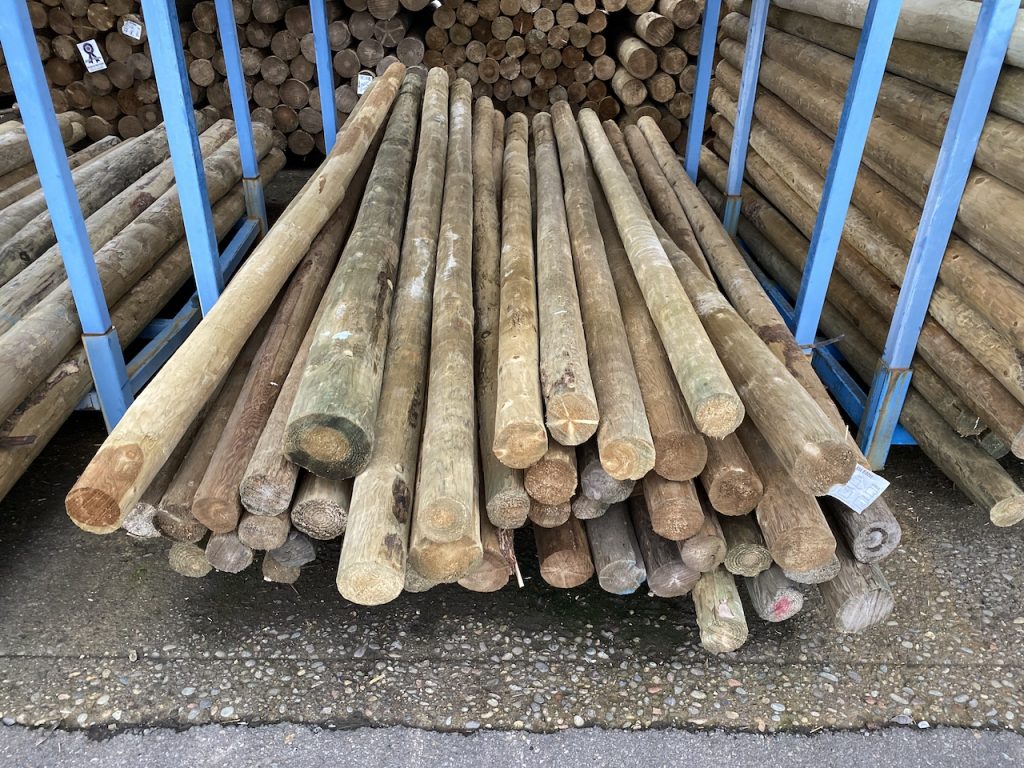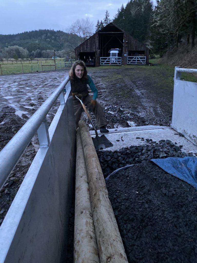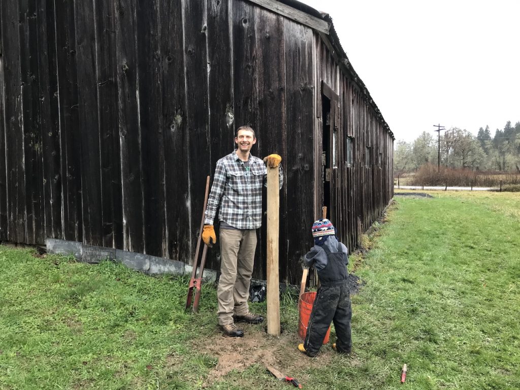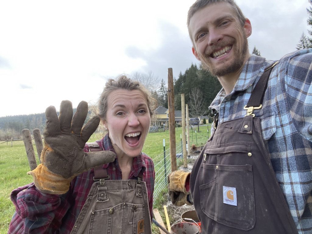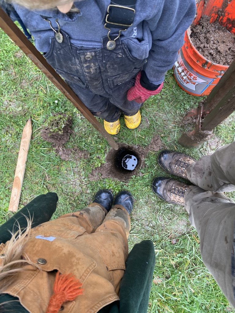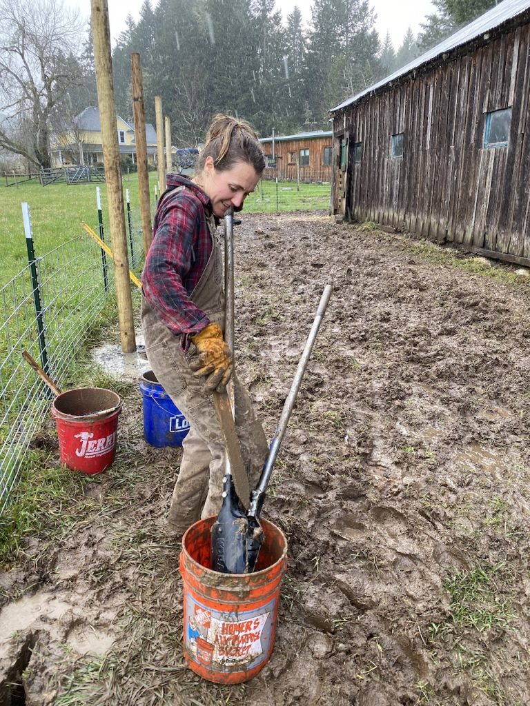 As many of you know Oregon gets LOTS of rain over the winter therefore, as you can guess, we worked many days in the rain while making this fence. Messy, messy, messy!! Just 4-6″ down from the surface our soil becomes clay. Clay is not only difficult to dig through but extremely sticky and oh so very messy. Due to the soaked earth our holes quickly became muddy wells which would splash and slosh as we jammed our digging tool in. By the time we had finished our first fence pole we all looked like Dalmatians! It was hard slow work.