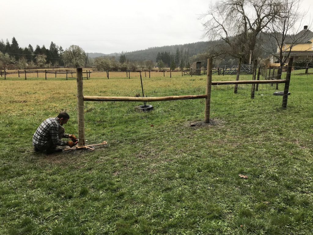 When putting up the fencing we soon fell into a rhythm of tensioning and stapling. We found a great technique that allowed us to keep the tension while we pounded in our staples. This was after we tried a couple different methods that ended in failure. You live, you learn, right? We chose to make the gates big enough that our tractor or a large truck could fit through if needed to access the septic or hayfield.