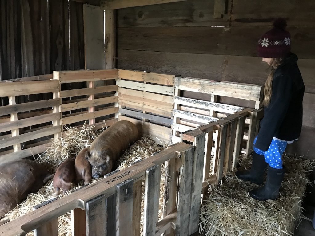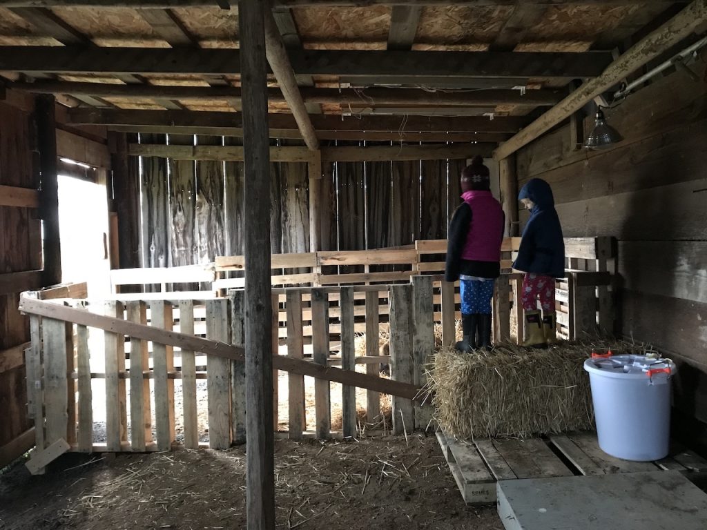 Justin built a pen with pallets which leads out the door of the barn to their outdoor pen. It worked out great and seems to be a good size! I’d say my only wish would be that a gate be added in the future. Right now we climb up and over the pallet wall to tend to the piggies. Eventually I’d like this pallet wall to be higher to make it predator-proof. When we do this we will definitely need a gate! When friends came over with their dog, the dog showed us how easy it was to hop over their pallet pen and chase them down! It was scary and gave us good information about how easy it was to get in.