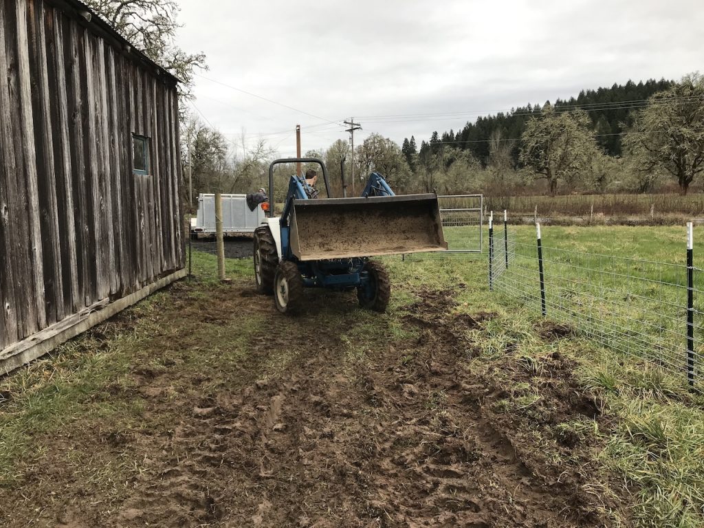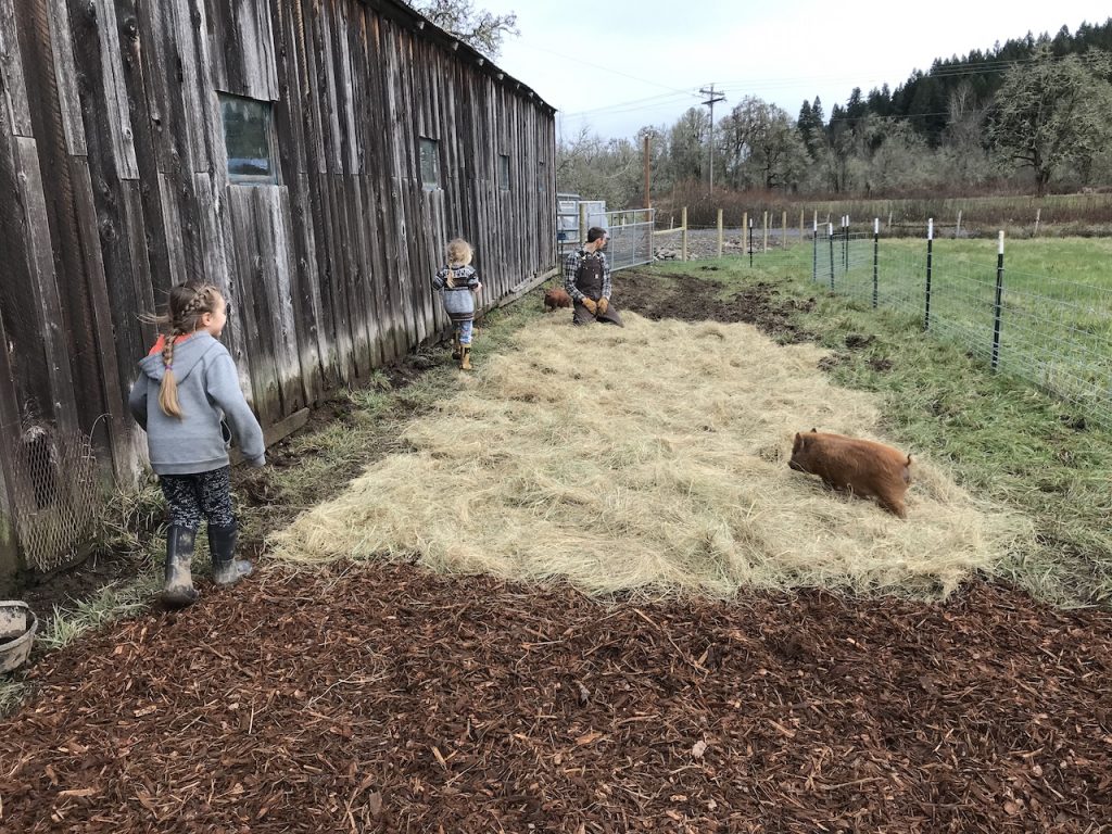 One thing I would do differently if we did it again would be to bring the mulch in bucket by bucket. The wheel barrow wouldn’t have worked because the mud was so deep but bringing the tractor in REALLY made the pen muddy. The pigs root up the top soil layer looking for roots of weeds but the tractor dug up much bigger ruts due to its size.