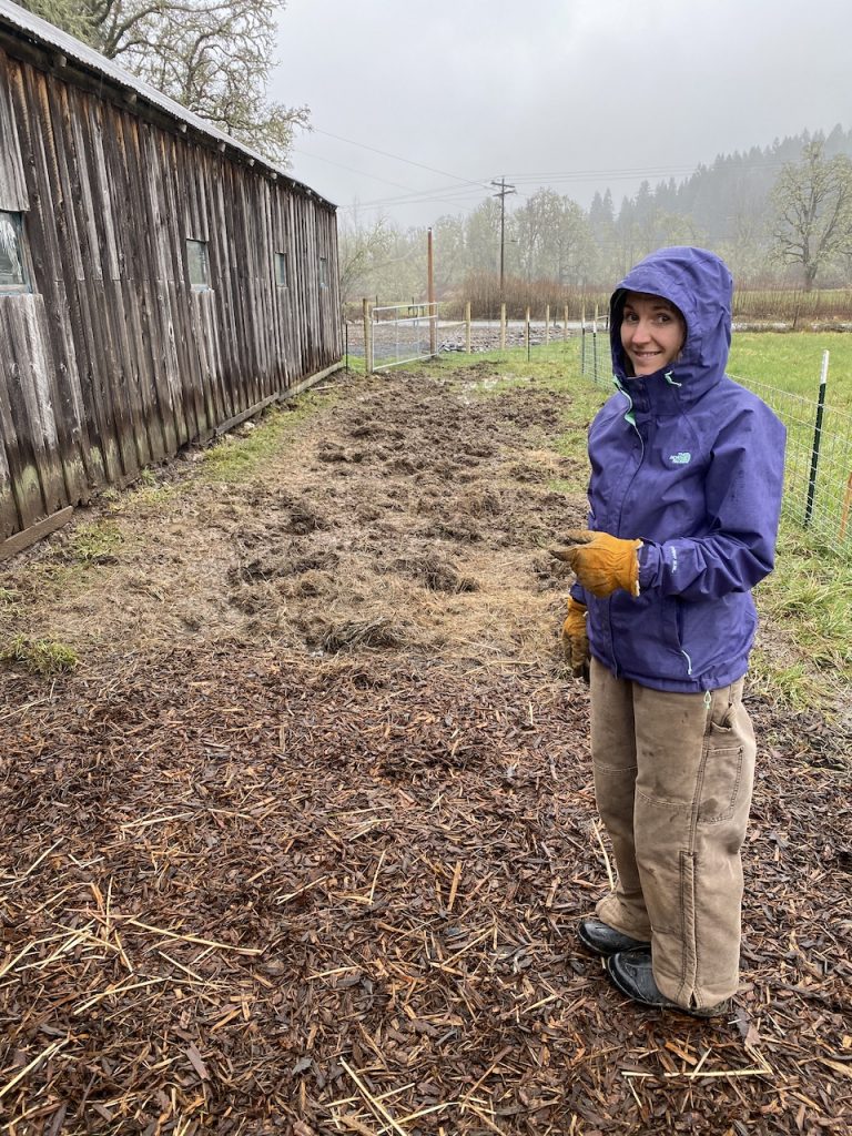 We debated lots of different solutions to this problem but what we ended up settling on was to buy 5 yards of “hog fuel” or “walk-on mulch”. Walk-on mulch is basically just big chunked mulch. We actually used the same stuff on the walking path we made through the woods. There were some down sides to this option: One; we knew after we had put the mulch down it meant that we wouldn’t be growing grass there anytime soon without some major work. Two; the mulch would eventually get mushed down into the mud and we would have to add more to the top to keep the desired effect. The reason why we went with it anyway was because it was a relatively cheap option and would be a comfortable and safe material for the piggies to walk and lay on.