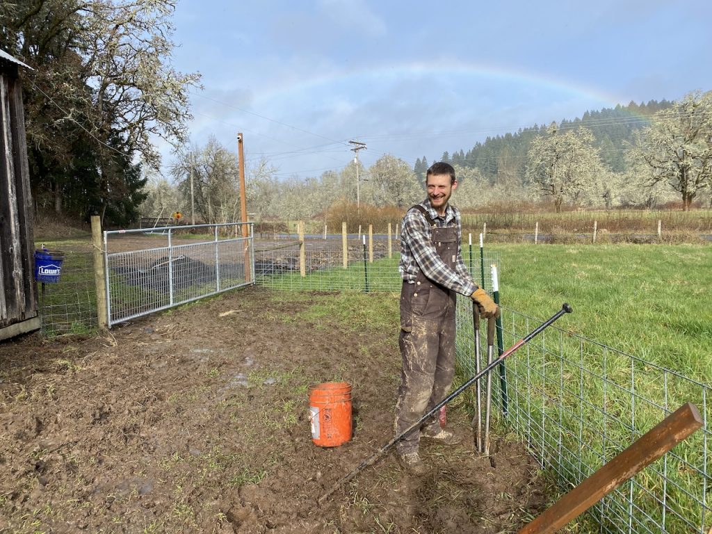 When poor Justin was out picking up all the supplies to build this enclosure he ended up lifting something in the wrong way while his knee was bent sideways and ended up ripping his meniscus (we think)!! He heard a crunching sound and…ouch!! We got him a brace which seems to help a bit and he has been healing pretty well. So, between my hurt wrist and Justin’s hurt knee together we made for one useful human! Justin did the ramming of the digging rod to loosen the soil because that hurt my wrist and I did the lifting of dirt, gravel and poles. It poured on us one day during our last pole of the day but for the next it was sunshine. The bright side of working in the rain is that you sometimes get to see a rainbow which we did! There’s always an upside folks!