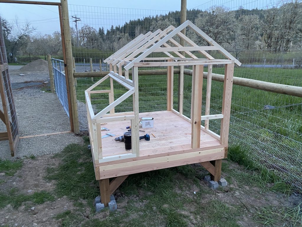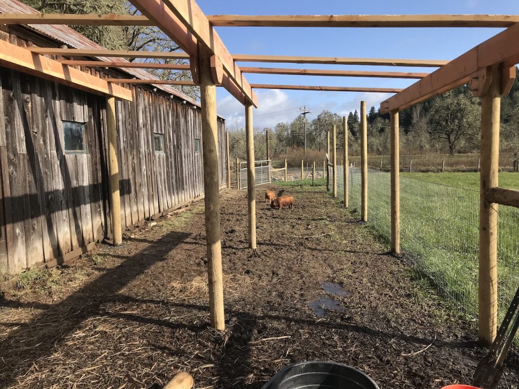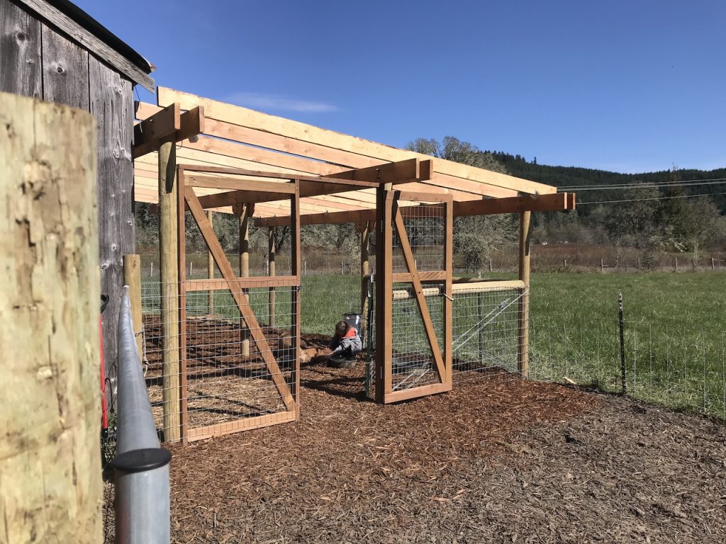This brings me to talking about the next part of the enclosure. We decided to put a roof on part of it as well. We are hoping this will help with drainage off the barn roof, as there is no existing gutters on the hayfield side, and also act as a shade from the hot sun. Justin is leading in this part of the project for sure! It has been tricky doing this project on Justin’s lunch breaks, evenings and weekends. Often times we feel like little ants in a big world. It’s taking shape though, slowly but surely!