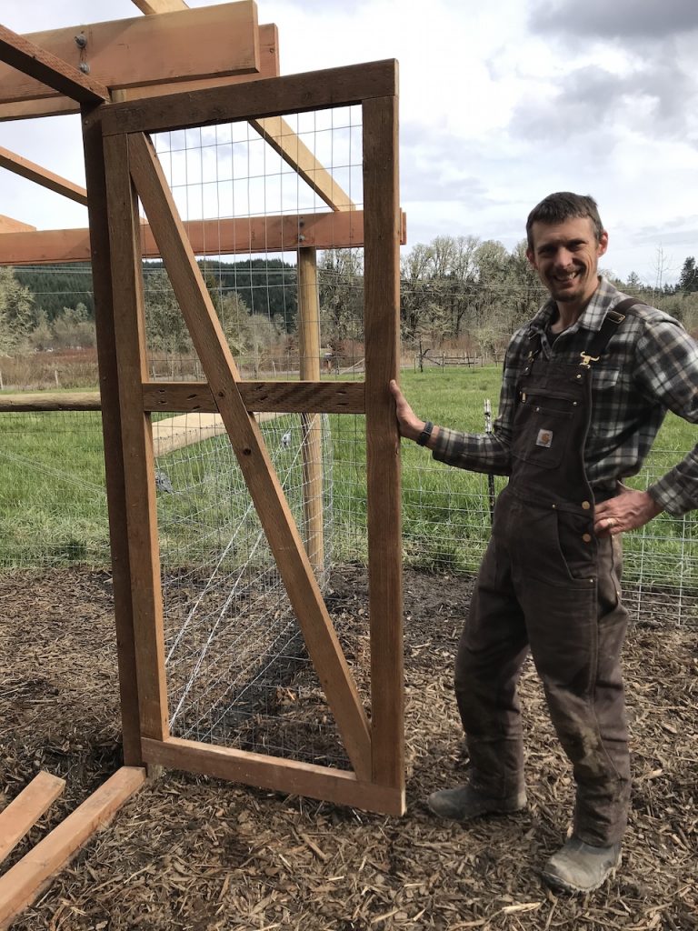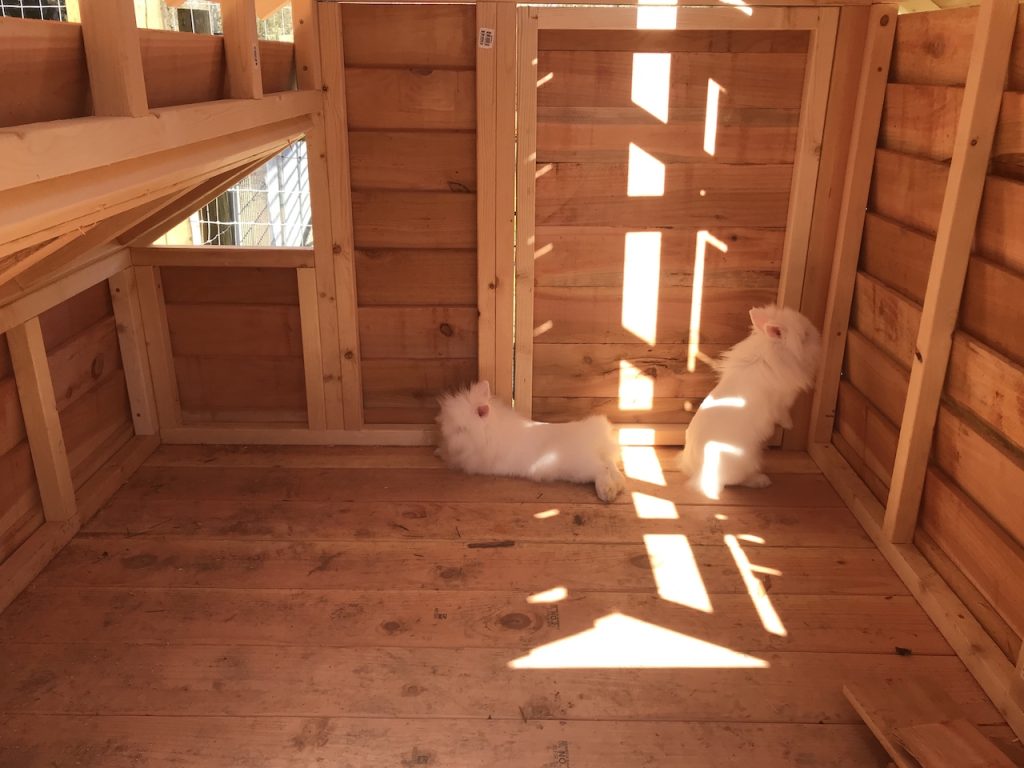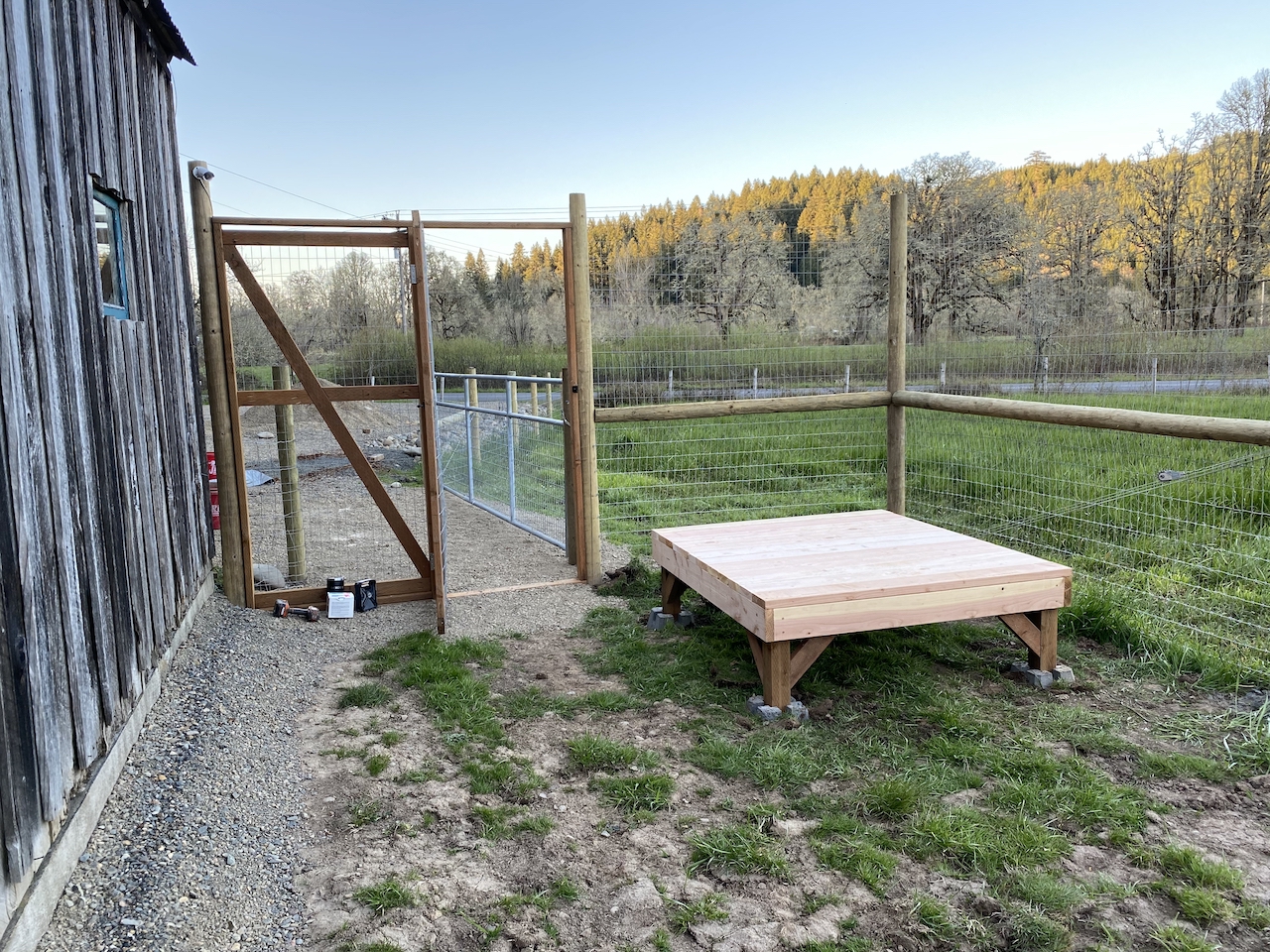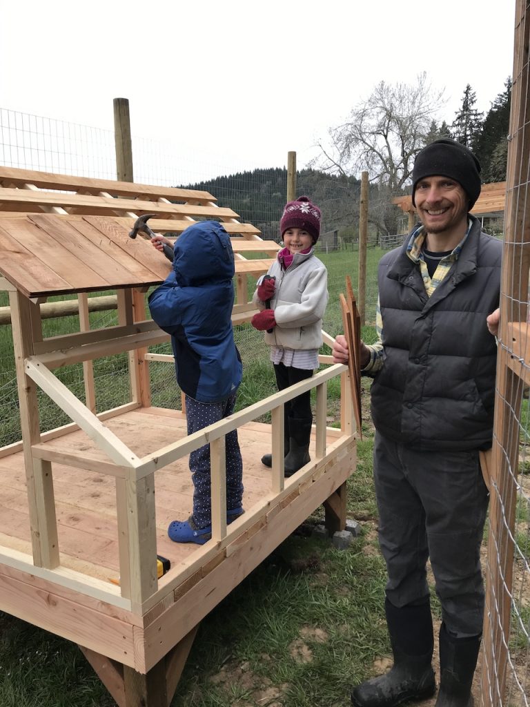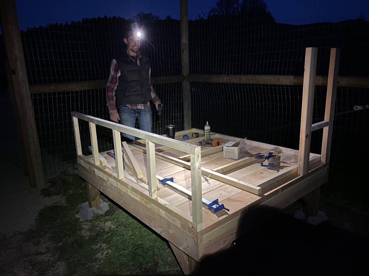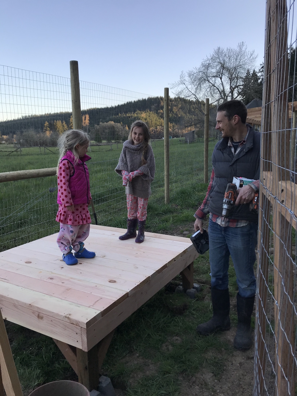 Here we thought we had another month before we needed their home built outside but, alas, many hours and late nights later the Quack Shack was created. Master builder Justin designed and built the beauteous Quack Shack with a few helpers here and there. He did such a lovely job making it fit our space and needs perfectly! Door just big enough for a push broom to get into, no funky corners for bedding to get trapped in, door the correct size to later add an electric door if needed, hatch to open to collect eggs… this guy thinks of everything!