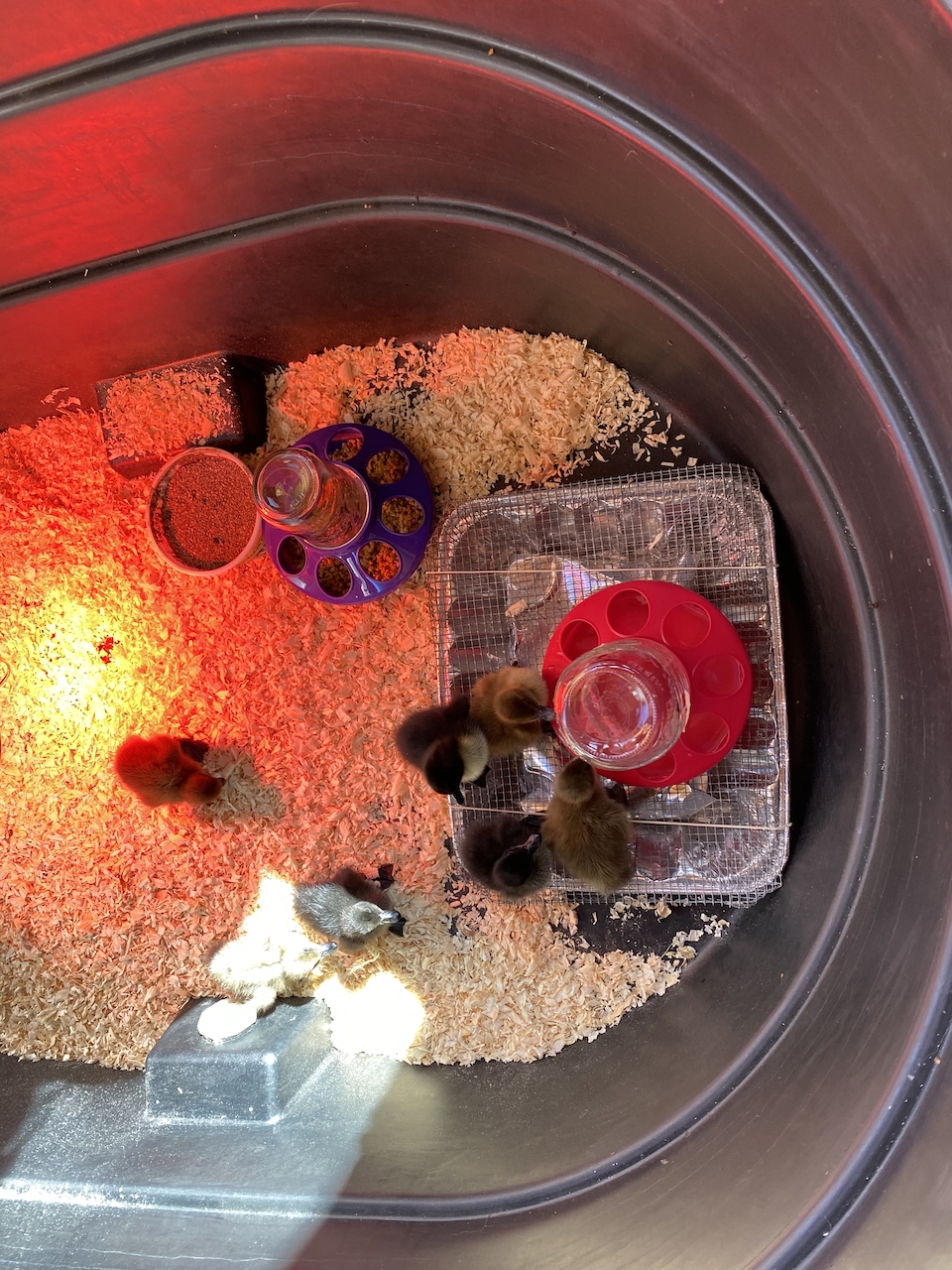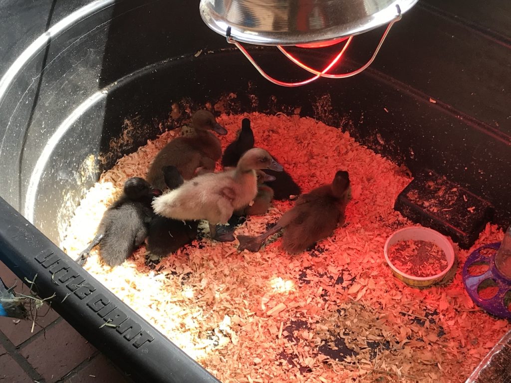 For the first short couple weeks of the ducklings’ lives they needed to be inside out of the cold. In the wild they have their Mama duck’s soft downy layer and body heat to keep them warm. They also get waterproofing oils from their Mama. However, in a domesticated setting without a Mama, the ducklings have to stay dry and warmed with a heat lamp.