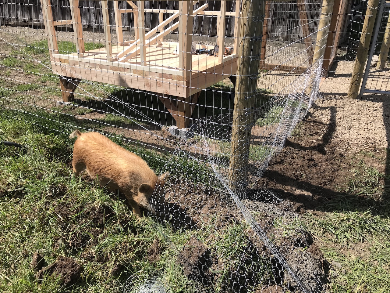 We created 8′ walls of fence posts and 2″x4″ metal fencing top to bottom. Each side (the piggy side and the duck side) has a pressure treated wooden framed wall and door for us to go in and out of. We also added netting to the top to deter birds of prey from swooping down and grabbing a bite. There are lots of turkey vultures around here daily. To add extra safety we also added chicken wire to the bottom 2 feet of the 2″x4″ fencing burying a foot of it along the sides to prevent predators from digging underneath the fence. If something really wanted to get in I’m sure it still could but we are hopeful that by having things this safe during the day and locking the ducks in the Quack Shack overnight we are covering our bases.