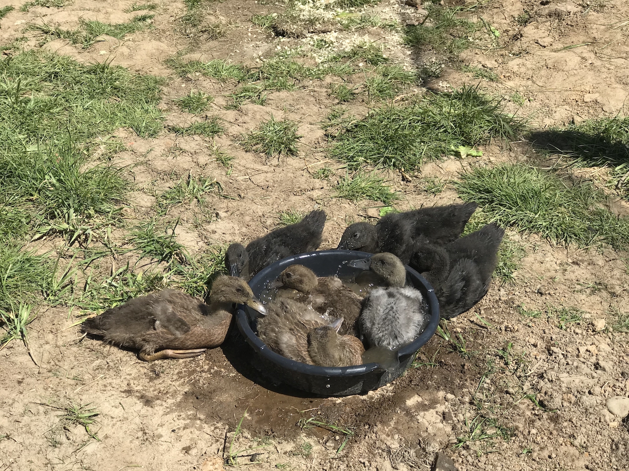 Even though the ducklings didn’t have their warm adult feathers yet we deemed it safe for them to move outside. The nights were no longer dipping down to freezing, we hung a heat lamp in there and were keeping careful track of the temperature within the QS and with a spy camera. Every good farmer has one these days, do they not? I also kept their water and food in there until the ducklings reached 5 weeks. Clean-up is now minimal for those cute things since I moved the food and water outside. Keeping their water clean is the only hurdle. Justin has something up his sleeve for this one! To be continued…