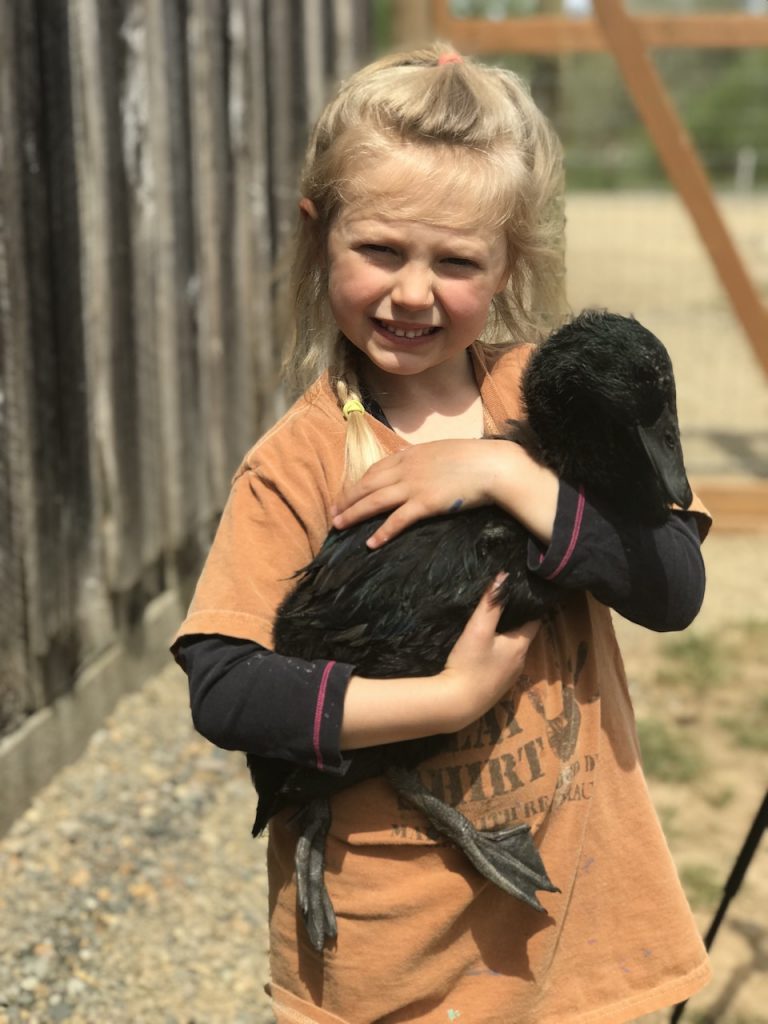 These ducks are getting huge and are so much fun to watch and hold. They are learning routines great too! In the morning the girls and I open the door and say, “Ducks in a row, out you go!” and they all head down their ramp and waddle over to me expectantly as I get them their water and then food. They eat some breakfast from our hands or containers and give themselves their morning bath in little tubs. In the evening when we want them to go to bed we say, “All ducks go to bed” and this is the absolute truth and it still shocks us, they all line up and go into the duck house. Once and a while they will crowd the ramp and one will fall off the side and have to make the journey again. Isn’t that crazy cool?! We trained them to do this obviously but I wasn’t sure training them would actually work! We go in their pen during the day to play with them but the combination of it being evening and us saying “All ducks go to bed” does the trick!