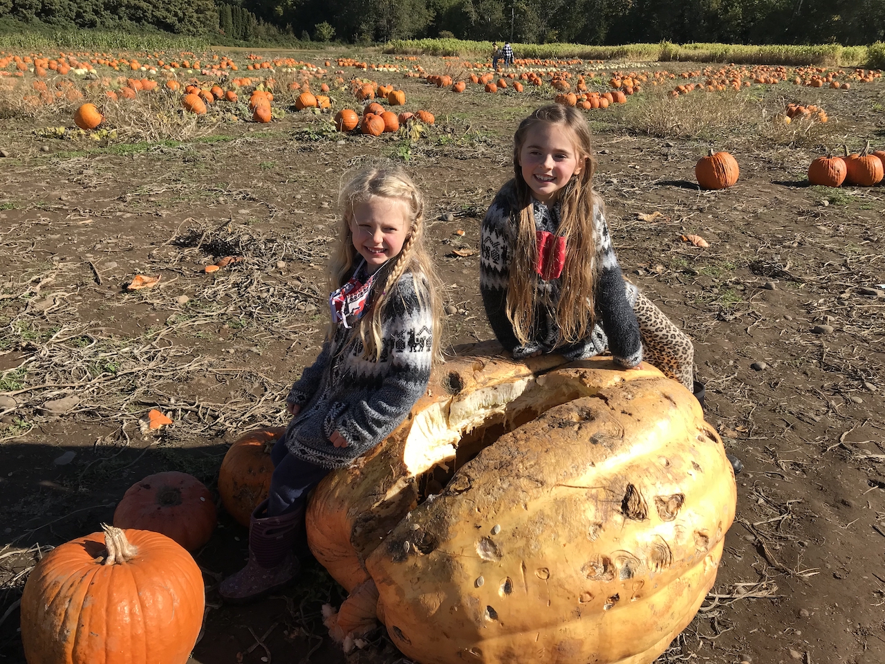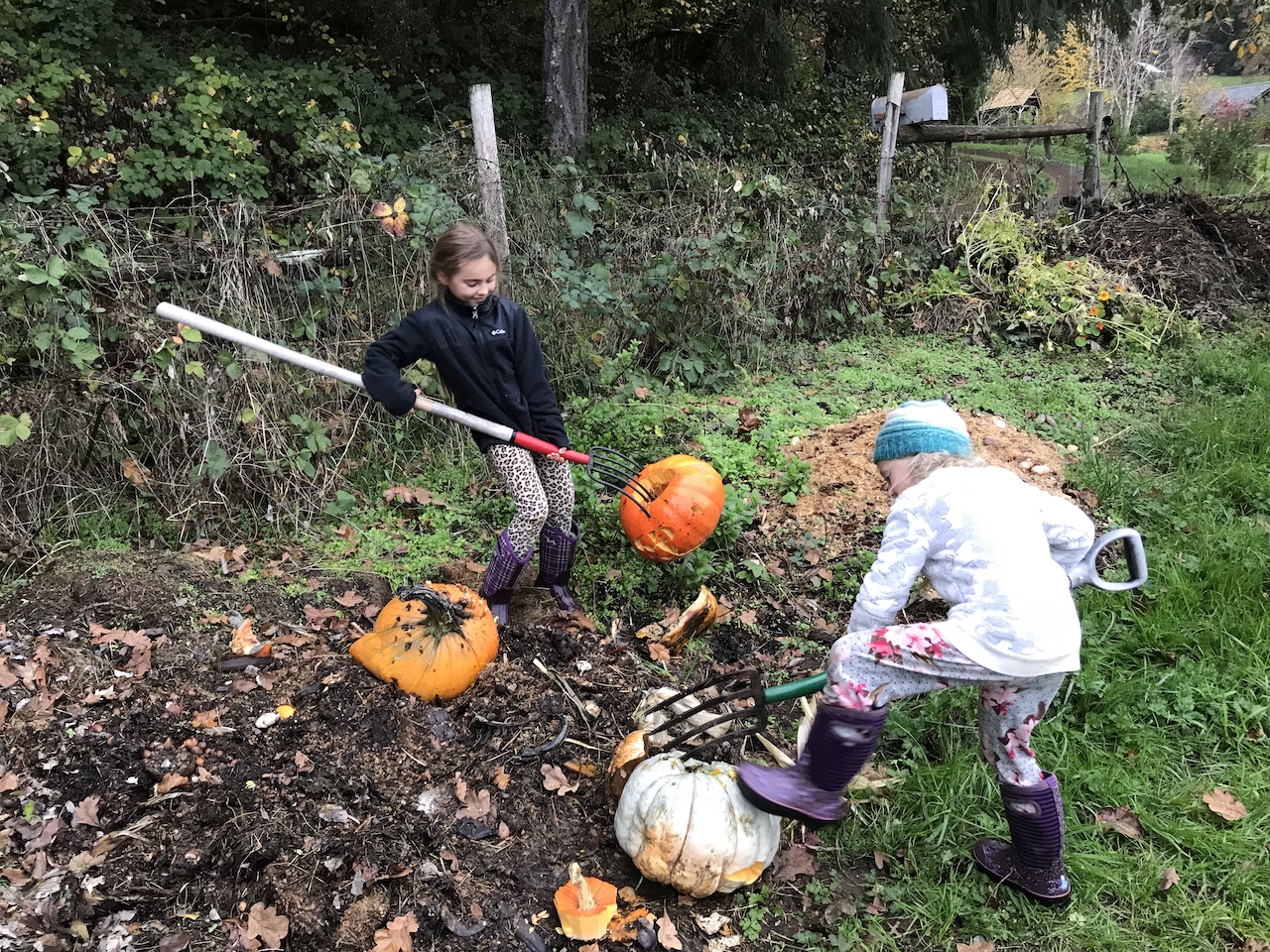 We grew a lot of cooking pumpkins in our own garden but the girls were wanting to carve some too. It seemed silly to carve up a perfectly good pie pumpkin so we decided to go to a nearby pumpkin farm to snag some. I was actually really surprised with how expensive they were! I ended up passing them up at the first farm we went to because I just couldn’t stomach it. $20 per pumpkin times 4 adds up. It seemed a bit looney to pay $80 for something we wouldn’t be consuming and would end up in my compost pile the next week. It wasn’t too much better of a price but we ended up getting the last remaining pumpkins from another farm nearby and the girls had a friend over to do carving on the porch. I learned that those pumpkin carving knives are pretty handy. Year after year I attempt it with a large serrated knife and boy, it is tricky! I feel like a maniac attacking the pumpkin.