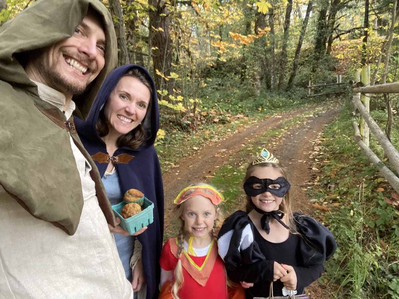 Again this year our neighbors saved the day and let the girls stop by their houses to say Happy Halloween and show off their costumes. Those two houses we visited was way better than going to 20 houses we didn’t know. An exchange of treats and chatting is worth a lot. Our oldest dressed up as The Princess In Black and our youngest dressed up as Cartwheel Queen, both from the same book series, “The Princess In Black.” Justin and I just popped on our medieval costumes and called it good.