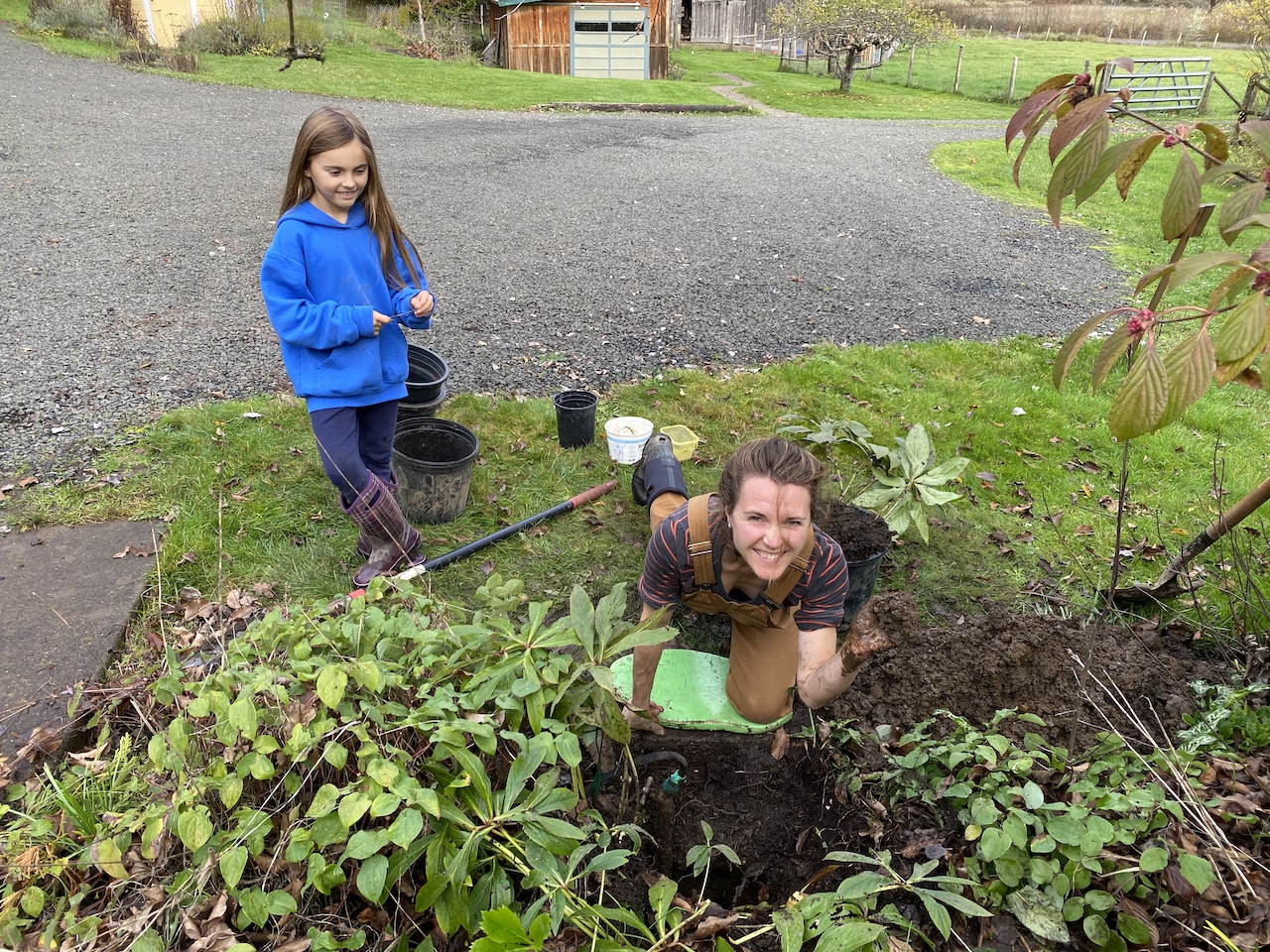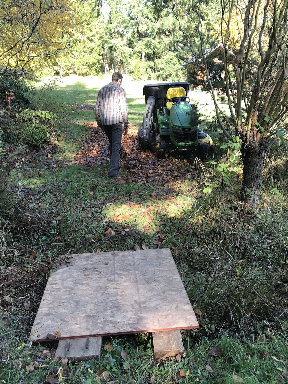 The last of the mowing was in order before the rain of fall set in. This meant getting to all the hard to reach places on the property. With this came some sticky situations we had to pull the lawn mower out of. There are lots of steep hills here on Crow Farm and the big old riding mower doesn’t always mesh well with them. We know well enough not to ride on the hills sideways but we tend to underestimate the power of the mower when going up hill. Justin got into quite a pickle up by our spring. The options were keep going down hill or…down hill. 🙂 The problem was there was a creek the mower had to cross due to its inability to go back up the hill in reverse. After some finagling and searching for random objects that could help us we made a precarious but useable bridge over the creek for Justin to very carefully but quickly, lest it get stuck again, cross over the creek. It worked! Lesson learned…until next year anyway.