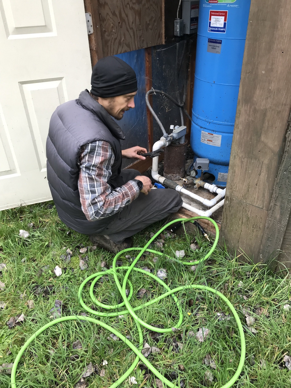 A first for us at Crow Farm happened. We noticed there was a little stream of water flowing down our front walkway to the house. I didn’t think much of it because we had a couple heavy rain storms and it was to be expected that the water from uphill would trickle downhill. It was after it stopped raining and the little stream continued that made us suspicious. I tried all the obvious things it could be coming from such as a spigot that wasn’t shut off all the way. No such luck. Justin had an idea to attach the air compressor to the pump house to see if we could detect bubbles coming out of the ground which would help us pin point where the leak was. It worked like a charm! Justin stayed at the pump house down in the hayfield while I stayed with the leak, relaying information. After I dug and dug I finally found where the leak was coming from! It was from the pipe leading to a flowerbed spigot. The hole was just bigger than the tip of a pencil but the pipe was very rusted and in danger of a much bigger leak very soon. It was a very muddy job! After digging into the ground about 2.5 feet I found that there was a junction where one pipe met another. Yay! Justin was able to cut off the pipe and replace it with a new one. Problem solved!