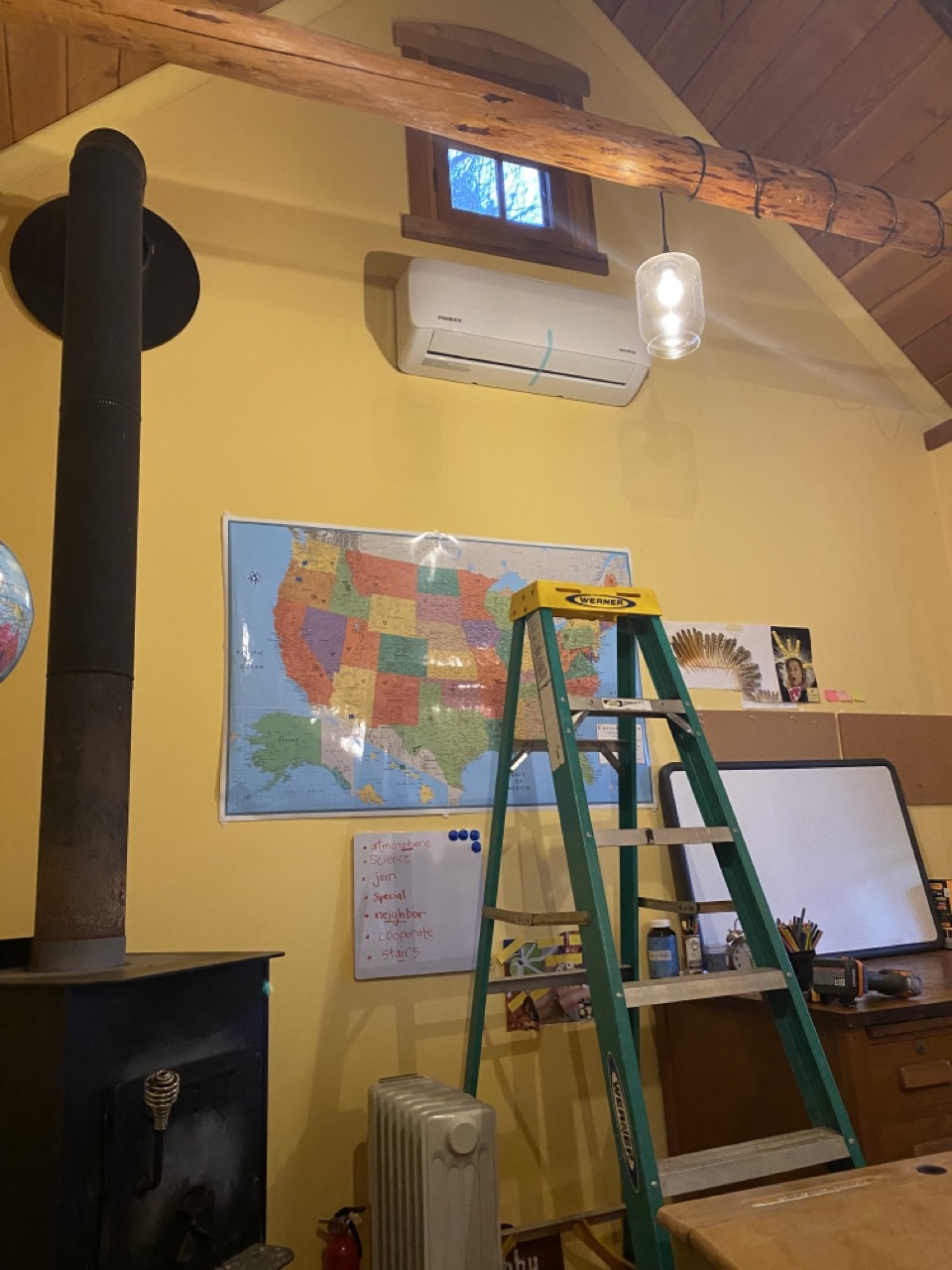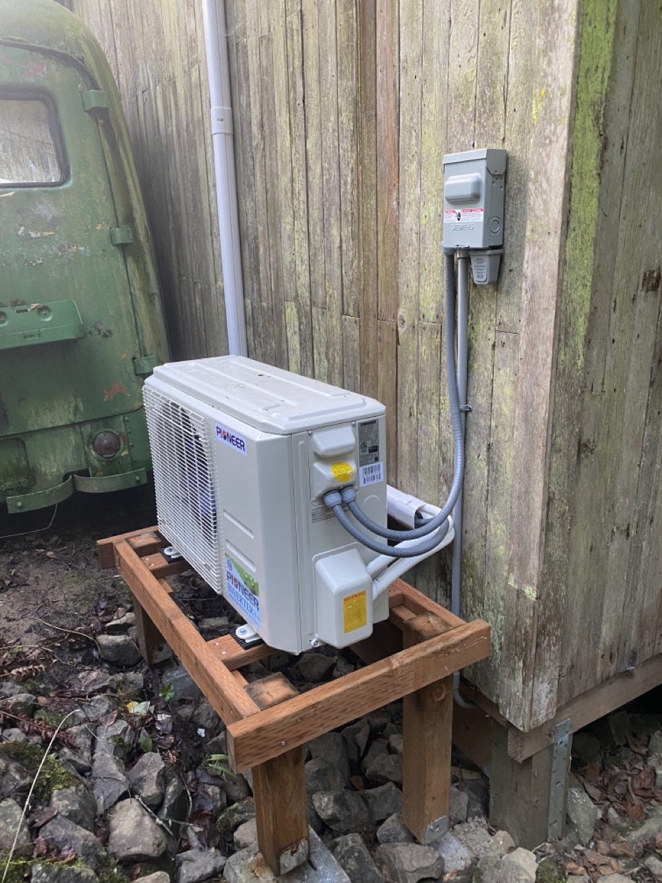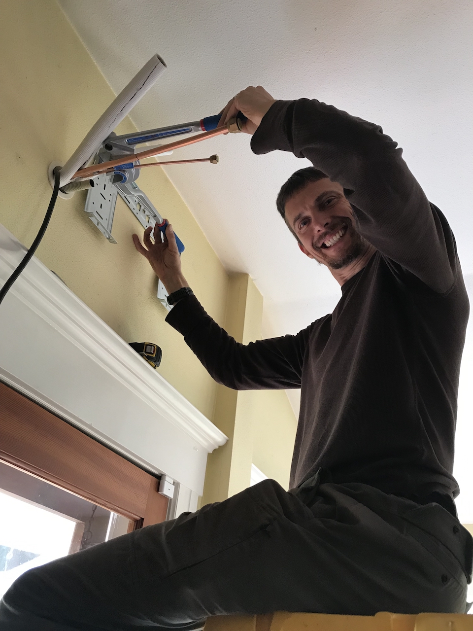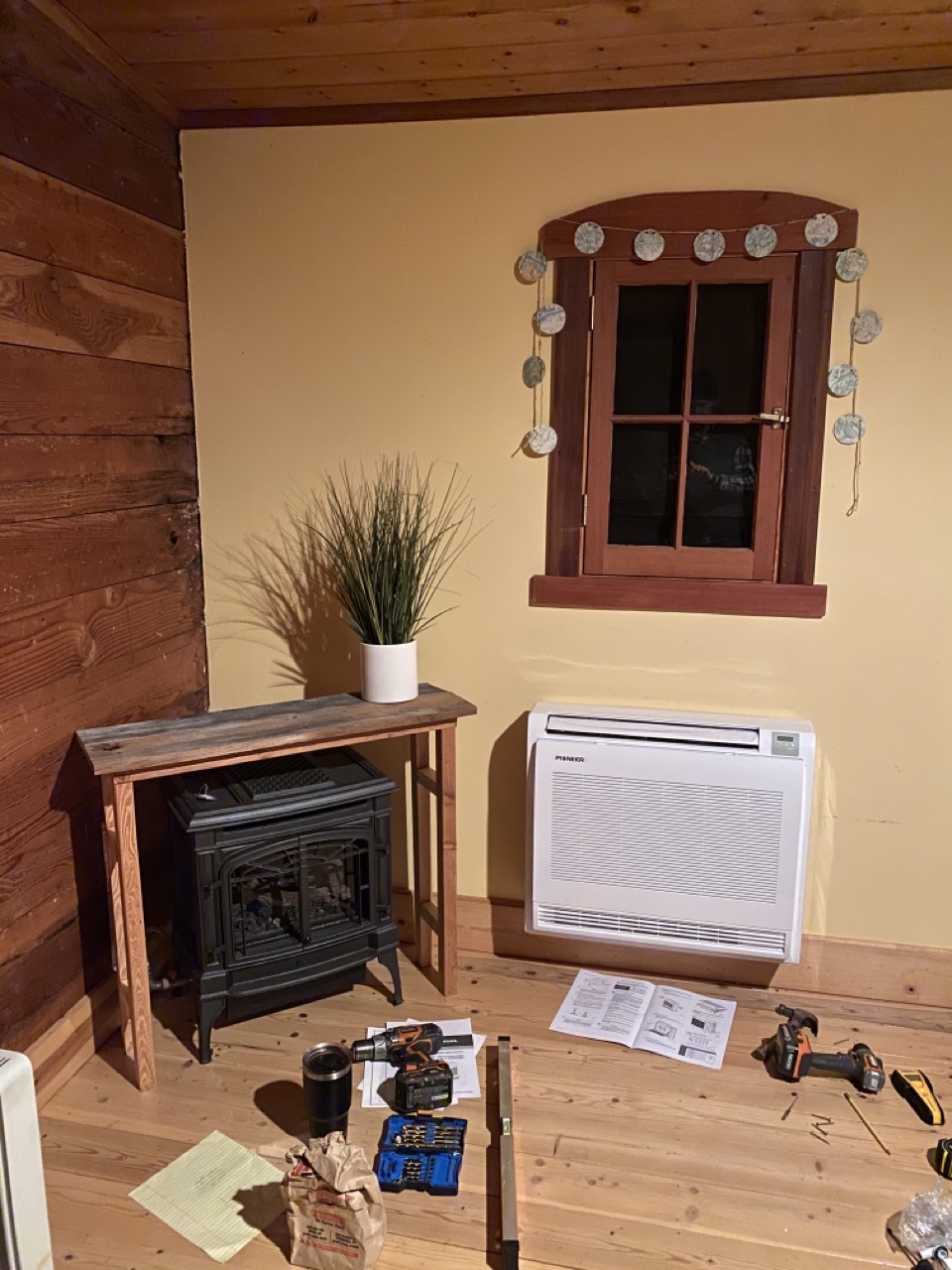 We wanted to find a more efficient way of quickly heating the kitchen. This is where the mini-split comes in. We had mini-split units installed in our Portland home as well as our cottage in Portland so we knew we loved them and they worked well as both heating and cooling elements. This time, however, Justin was the installer. He found that he could order all the parts he needed through a couple online companies. In order to do the job properly he did have to invest in some single purpose tools, which we try hard not to buy, but in this case it outweighed paying someone labor costs to install it for us. We figured we probably saved about $4000 on each unit installing them “ourselves.” And by “ourselves” I mean Justin. 🙂