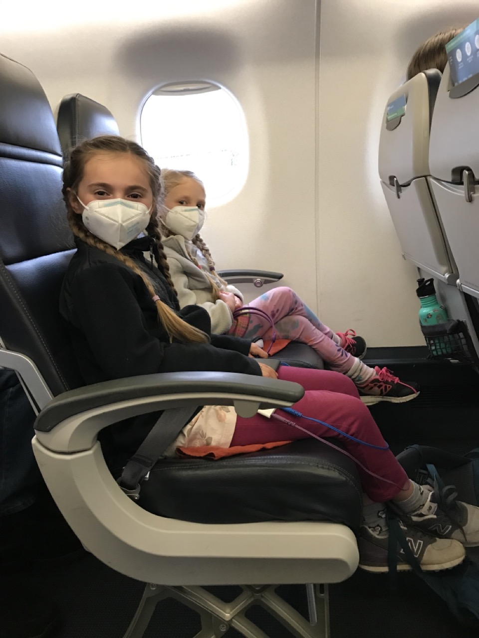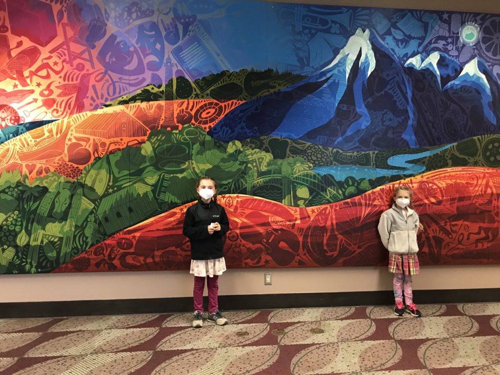 After we got through security we were told that to rebook flights you had to go BACK out through security to do it out at the main airline desks. The girls and I stayed behind, us trying to look on the bright side of things and being distracted by the airport artwork. Justin called me about 20 minutes later letting me know he booked us all for a VERY expensive last minute flight on Alaska Airlines for 2 hours after our original flight. Thank goodness! How very ridiculous of us!! By the time Justin got out of the long security check we had just enough time to use the bathroom, take a deep breath and board the new flight. We were so excited that at last we were on our way!