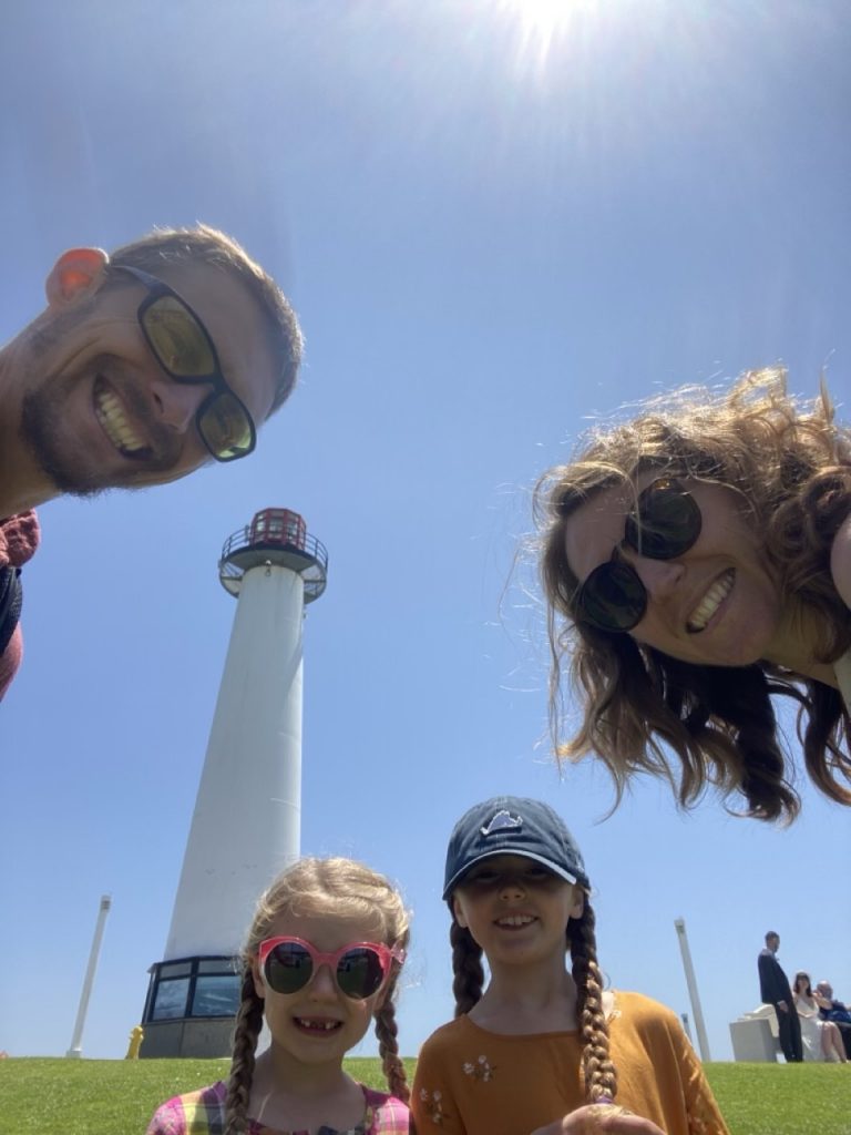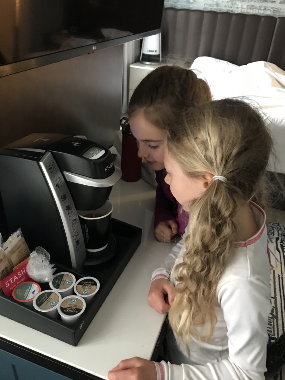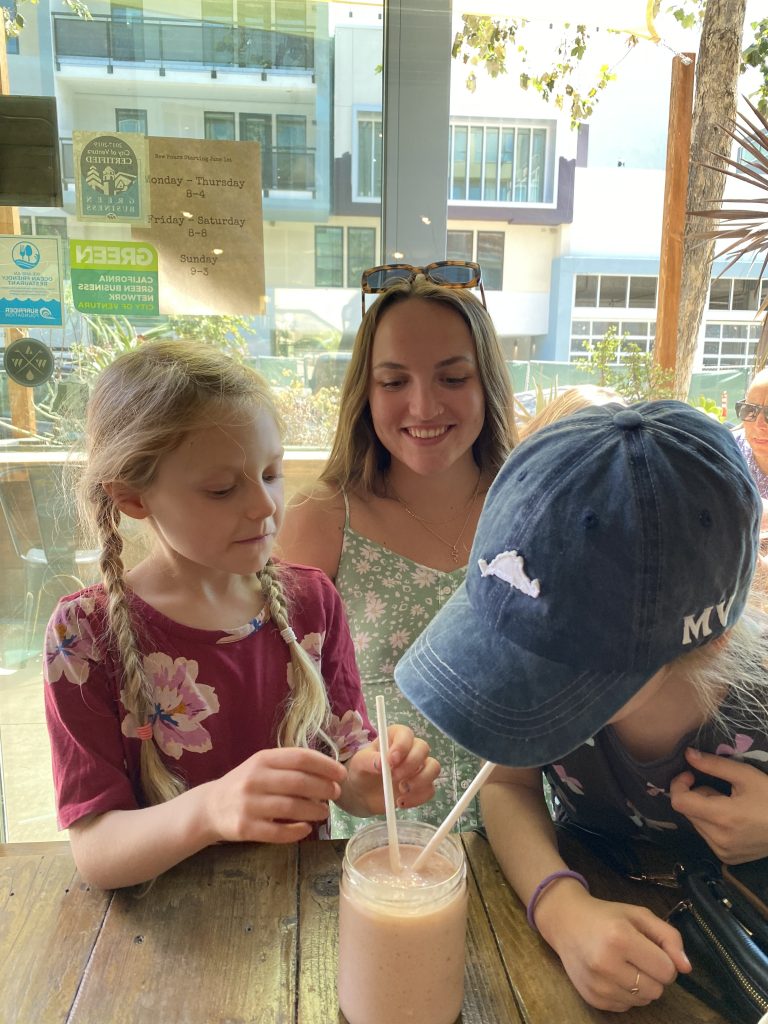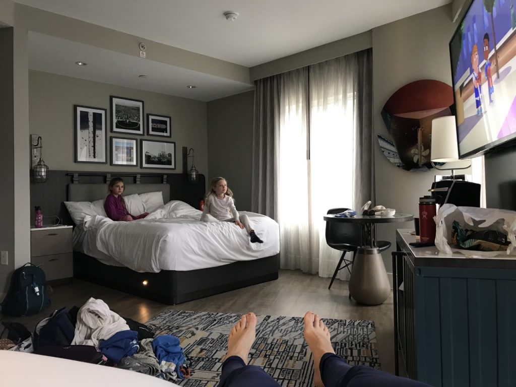 Since the next day we were flying out of John Wayne in Annahiam, CA we got a room at the Hyatt Centric in Long Beach so we’d be fairly close to the airport the next day. The Hyatt was like a glorious palace! The beds were SO comfortable and the room set up was absolutely ideal for a family with kids. It had two queen sized beds at just the right angle to each other and a dividing curtain that worked great for the girls to fall asleep on one side while Justin and I chatted quietly and did computer work on our side. I feel like getting a really good nights sleep on a comfortable mattress is worth so much. People are so much cheerier and forgiving of things after a good nights sleep. I would think it would always be worth upgrading mattresses to please guests and cutting corners elsewhere if needed.