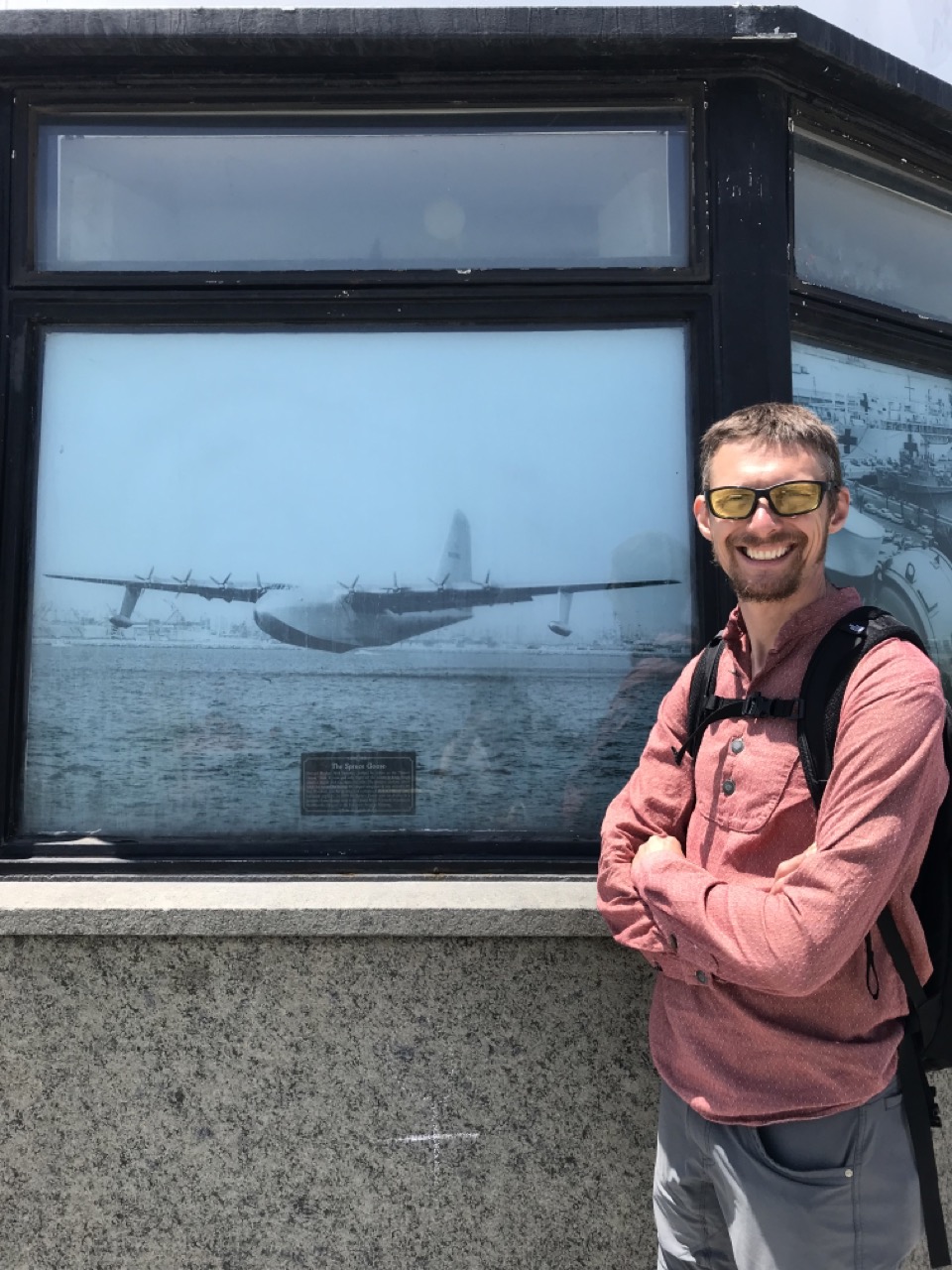 We discovered that the Spruce Goose plane took its first and only short flight on the waters that we were strolling on. We used to visit and tour the Spruce Goose at McMinnville’s Evergreen Aviation & Space Museum in Oregon. The Spruce Goose, built of wood, was intended as a transatlantic flight transport during WWII but wasn’t completed in time. It was the largest flying boat ever built yet was deemed unable to fly over long distances for additional flights. It is really interesting to tour because of its construction and size!